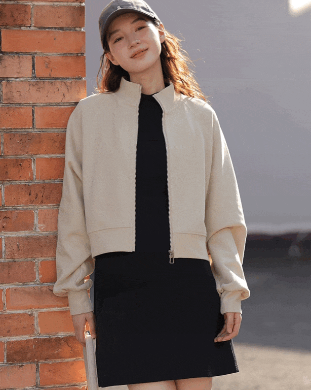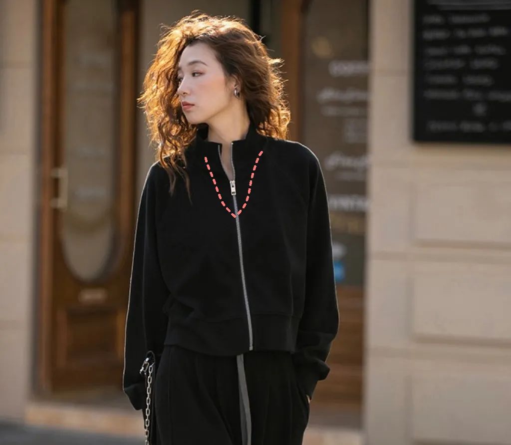 稍微拉下拉链,即可塑造V领效果:拉长脖颈线条,特别显脸小