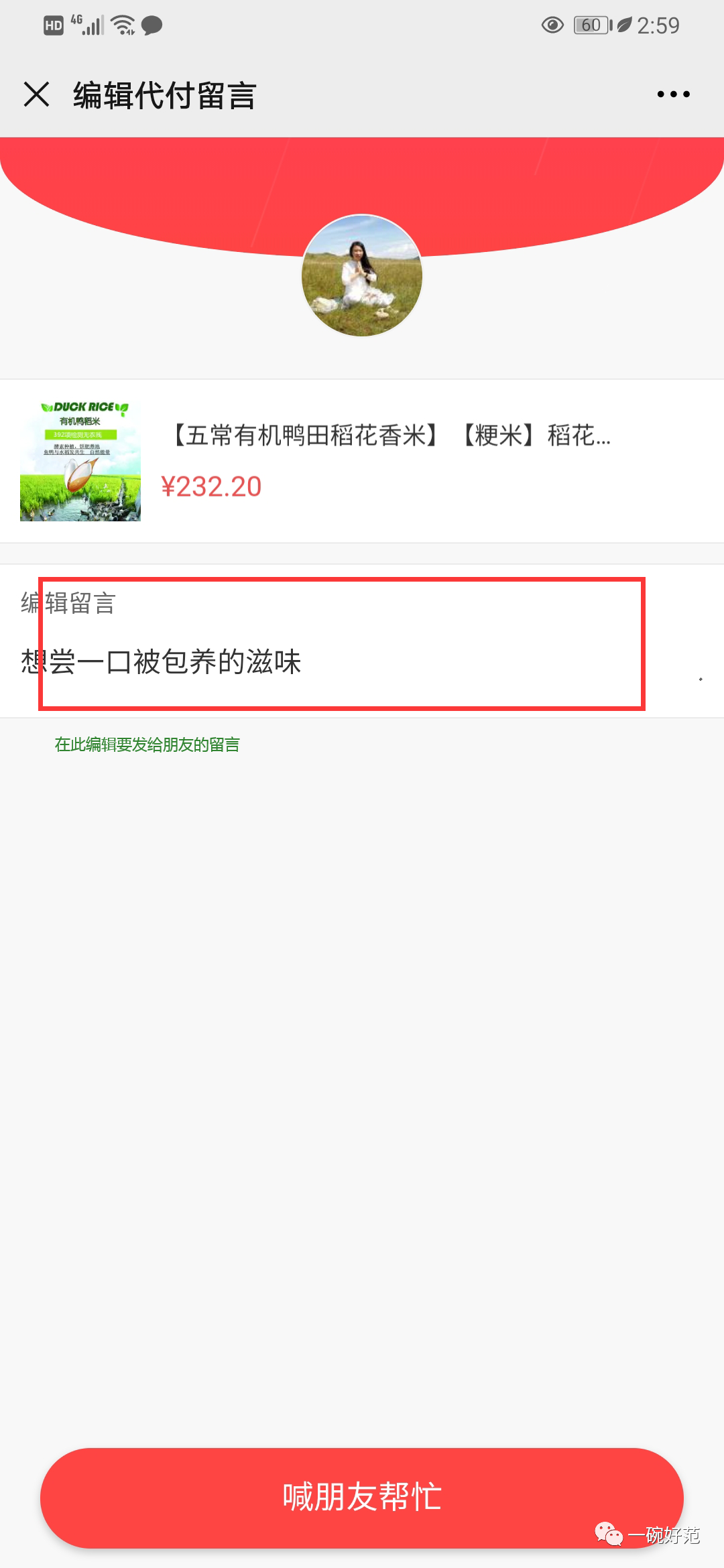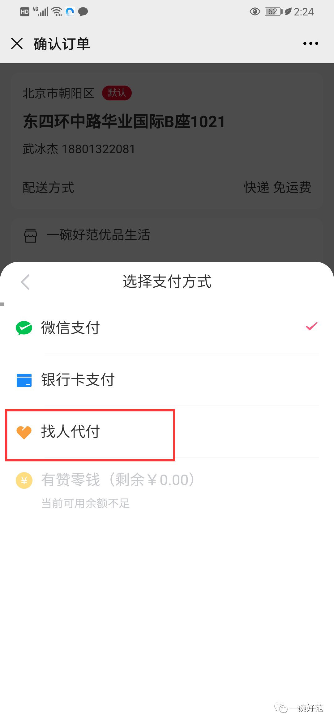 一碗可以用微信支付、银行卡支付及找他人代付。如需他人代付,只需将产品在支付点选择他人代付并此此链接转给微信好友即可