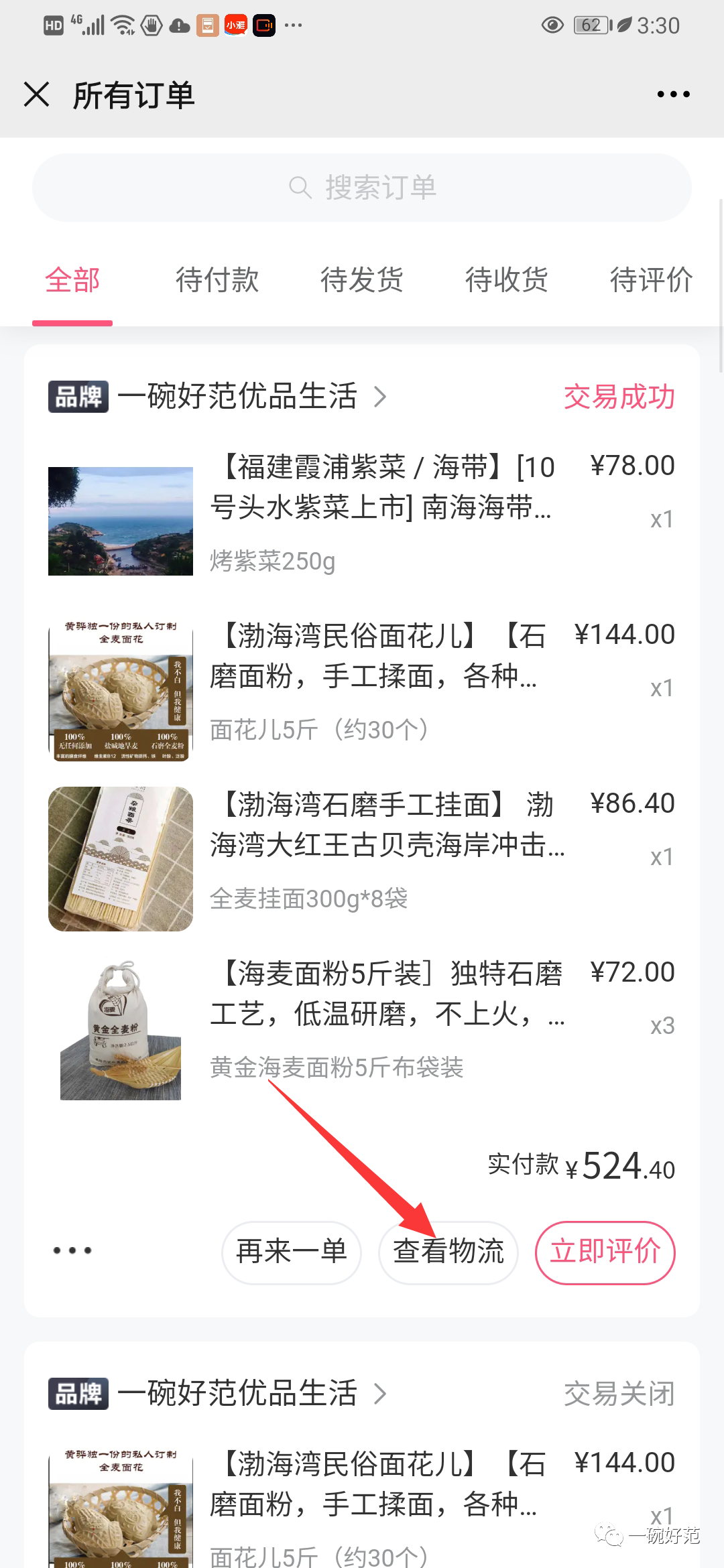 1、进入会员中心,查看订单情况,可打开我的订单查看全部订单(图1),找到所需要查看的相应快递商品,点击右下角查看物流(图2)