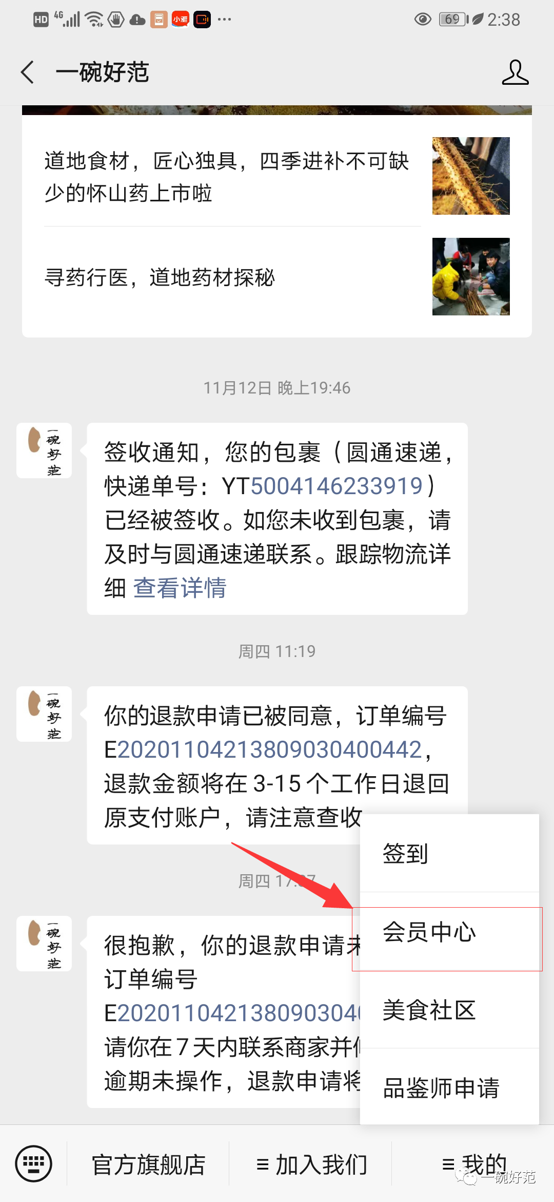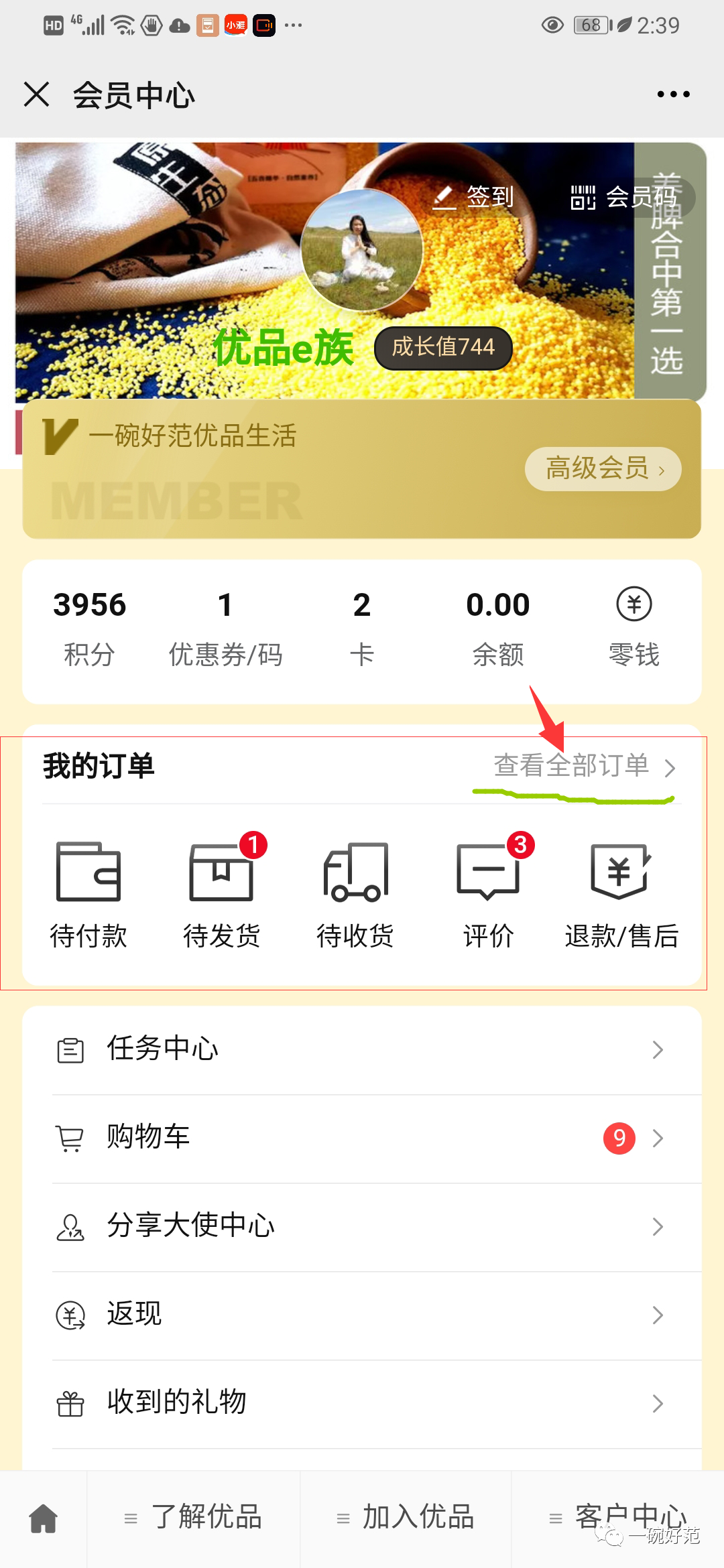 方法二:打开一碗好范优品生活有赞微商城,也可以通过微信进入“官司旗舰店”进入手机屏幕右下角“我的”,然后再进入 我的订单,也是会员中心。