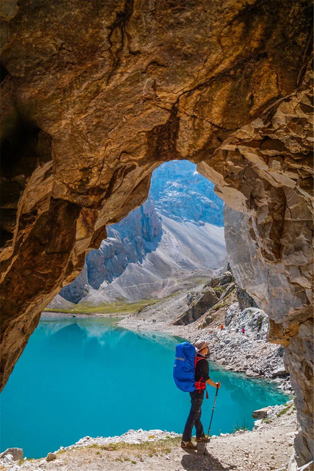 达坂最高海拔3900米,没有高反的困扰,累了不过停下来休息喘口气,并不算难。云散天晴,翻过达坂不久天堂湖便“半掩琵琶半遮面”地出现在眼前。