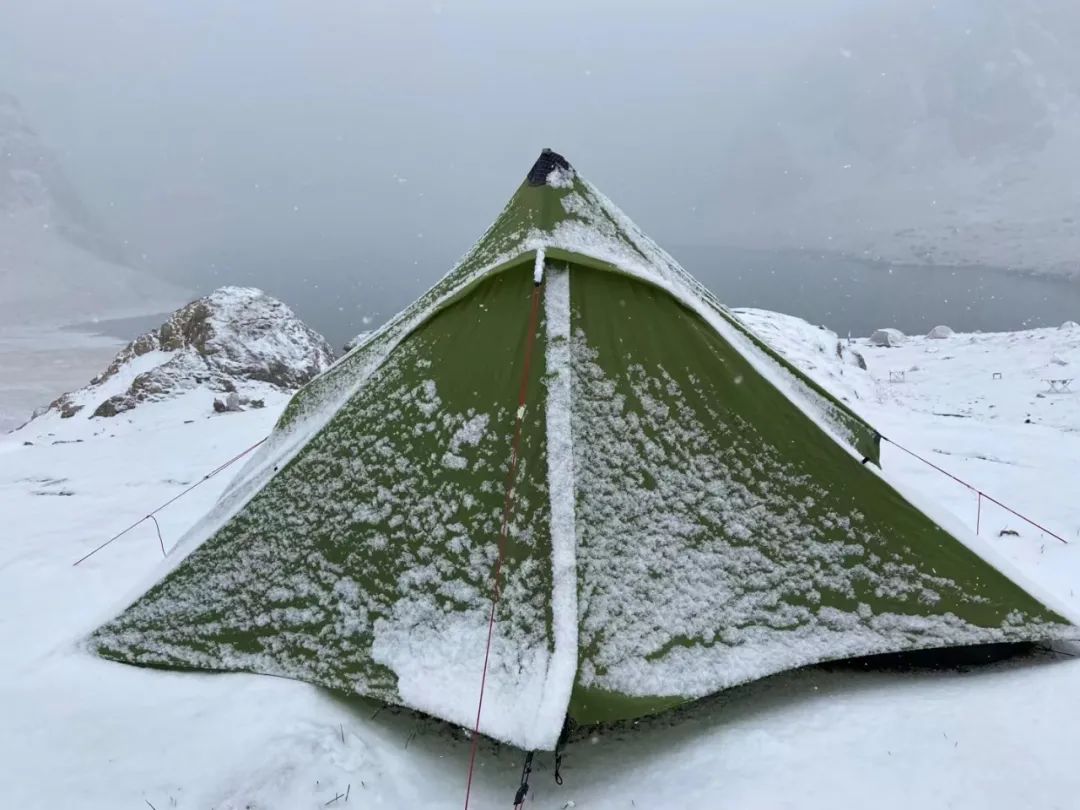 白狼冲了姜茶,指导姐赶紧换上干爽衣服,裹好睡袋。我想起前期沟通时有队友提到带了暖宝宝,便去借来两片给姐姐贴在了前胸后背,嘱咐姐有需要随时叫一声,如此折腾一番,忐忑退回厨房小天幕继续煮水。