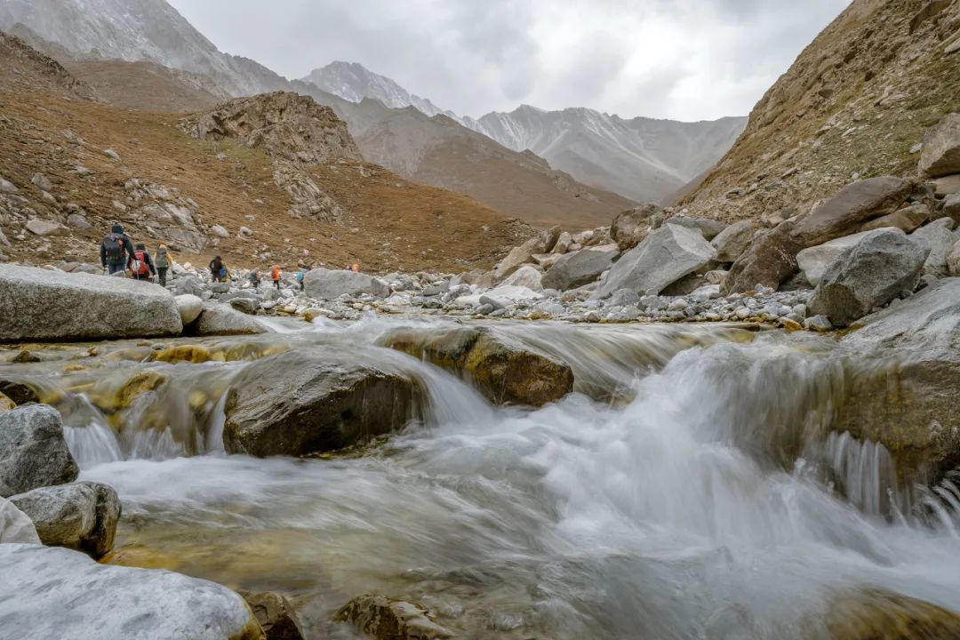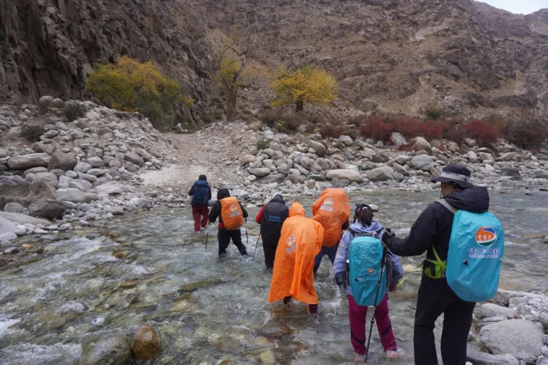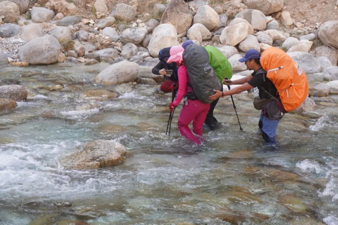 之后转个弯便彻底进入山谷之中,入口处的检查站一并消失在身后,第一次过河体验也随之到来——领队有提前交代前两天全程溯溪鞋,直接趟就完了!