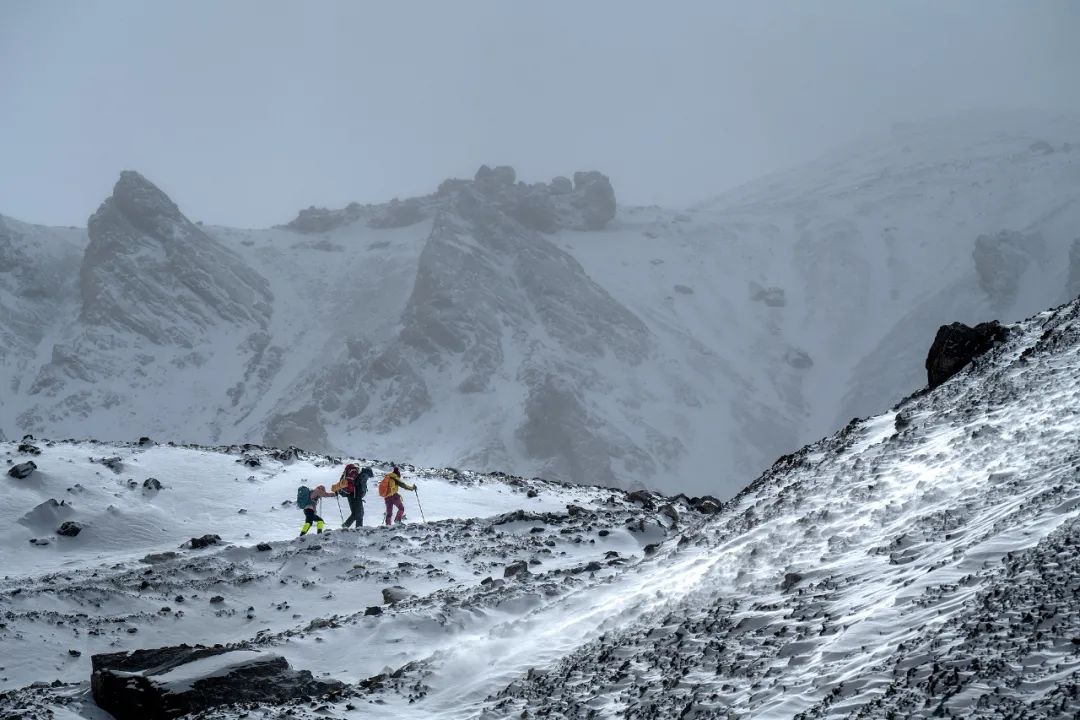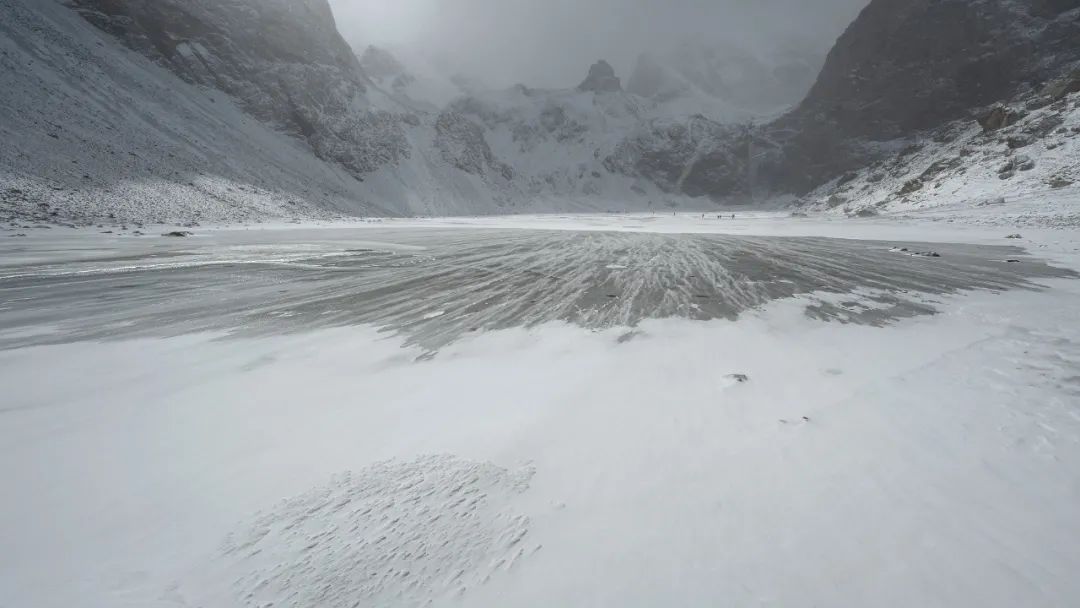 这么说不代表后面二爬阿克布拉克达坂时就不冷了……海拔近4000米的达坂上大风横吹,地上的雪粒子沙尘暴似的一波波卷来,搭配着脚下打出溜的立体体验,即便套了冰爪,走起来仍可谓步步惊心。