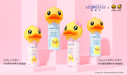 也是在这一年,米蓓尔首次尝试跨界联名,与B.Duck小黄鸭携手打造了联名版精华水,并于六一儿童节当天官宣上线。我们希望通过B.Duck小黄鸭积极向上、乐观治愈的形象,加之米蓓尔修护敏感治愈肌肤的产品理念,能够给大家带来更多的温暖与“治愈”。