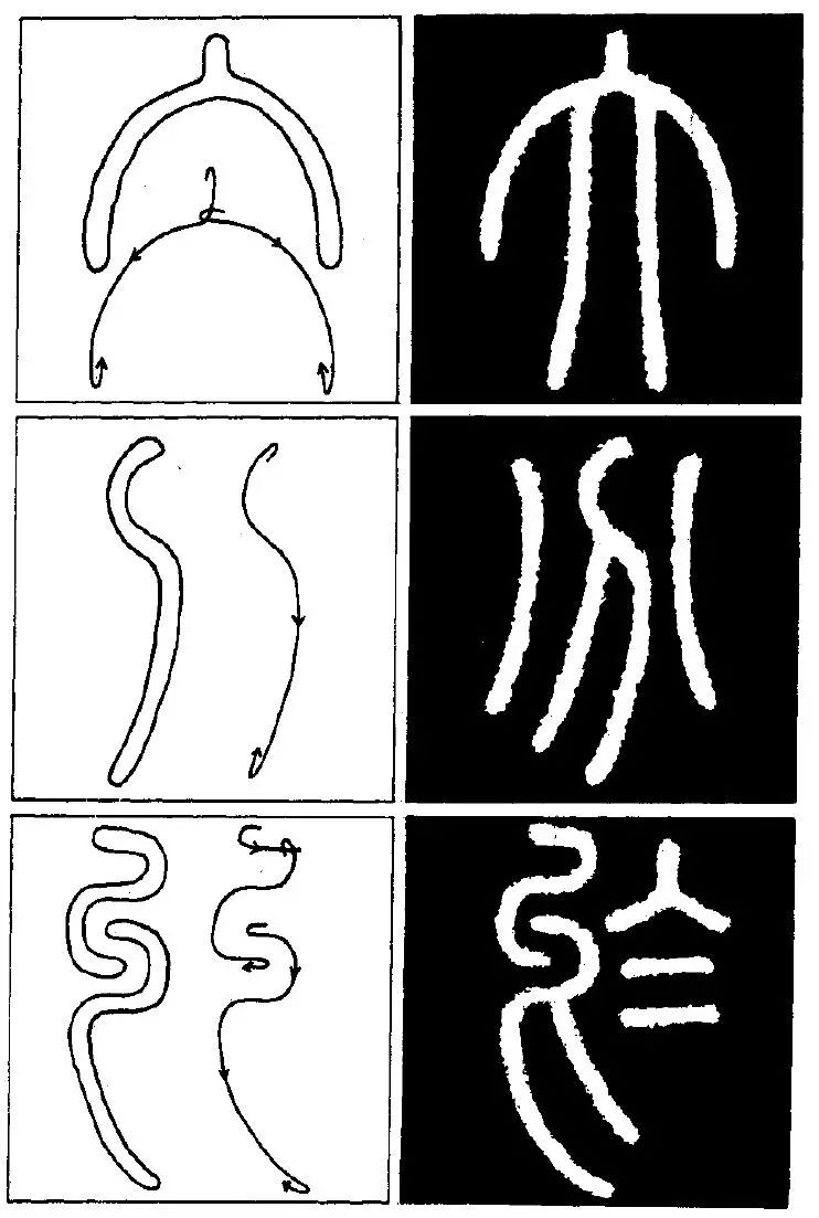 要做到这一点,不仅需要一定时期(甚至长时期)的反复练习,而且要勤于思考,分析运锋铺毫过程中的具体表现,即不同的用笔方法下,点画线条所产生的形态,从中找出一些艺术规律。