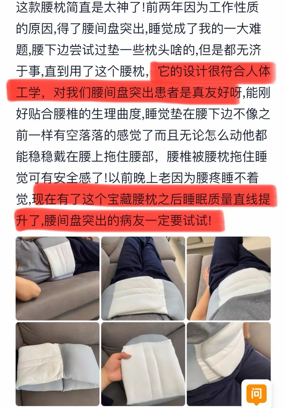 后来意识到,不如自己购买一个护腰枕,这样在家里就能预防、保护腰部。
