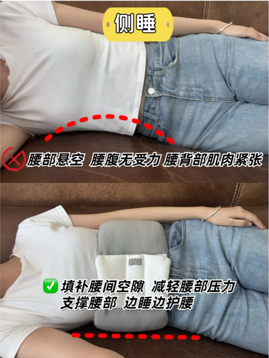 有的家人平躺时腰部悬空像 "架桥";侧睡时腰部扭转牵拉,翻个身就疼醒,一觉醒来比不睡还累。