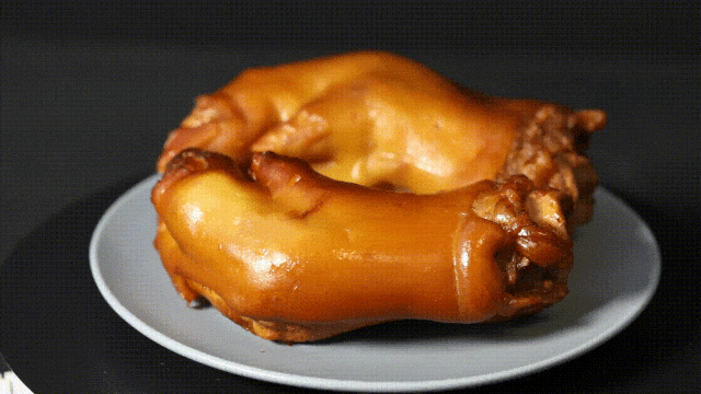 整只猪蹄,胖乎乎的,肉多骨少蹄筋弹,冷吃很筋道,想要软糯点,可以用微波炉转个两三分钟。加热过后的猪蹄,超级软糯,黏嘴巴的那种,肉筋缠牙。