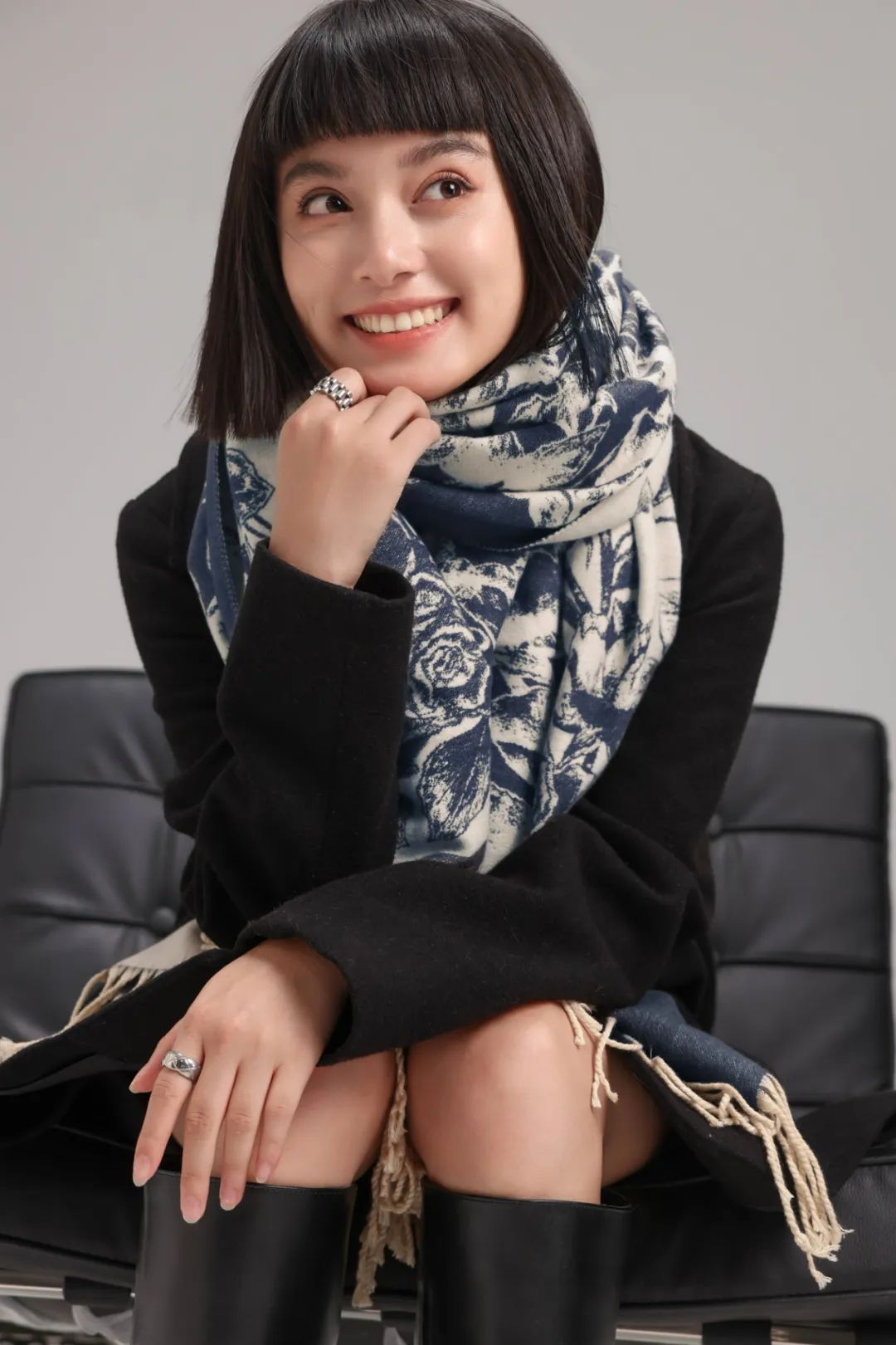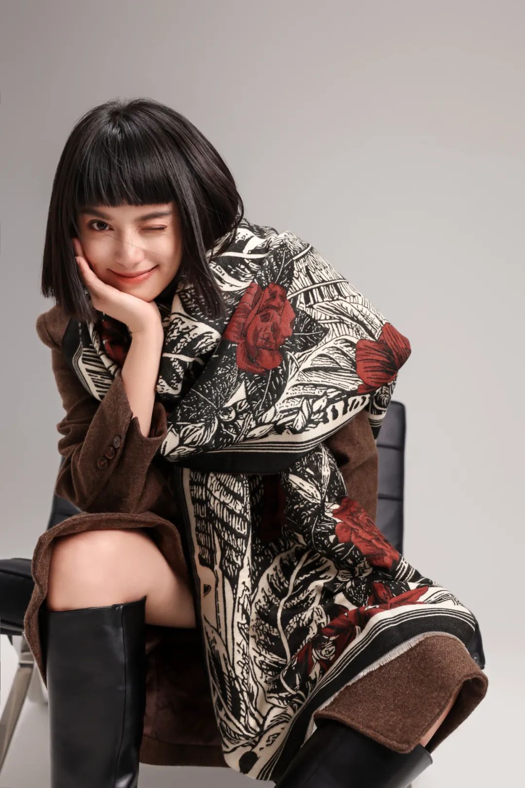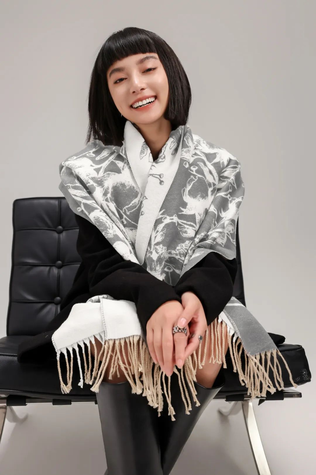 黑白配色的围巾中跳跃出一抹红,艳丽中带着高贵典雅的感觉。