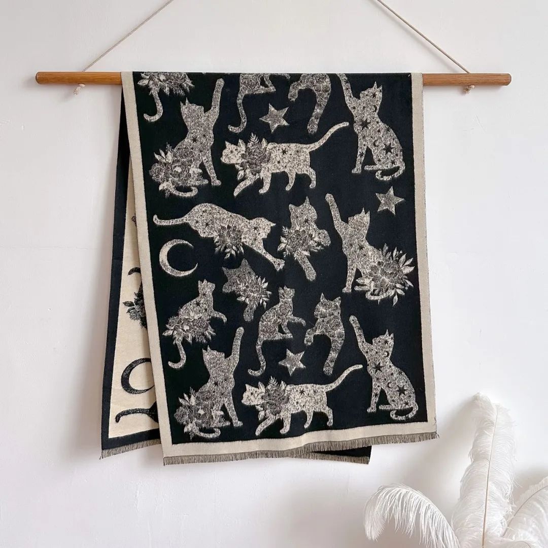 脖颈戴玫瑰花的猫咪+身披星星月亮的猫咪,立马让整条围巾充满灵动感。