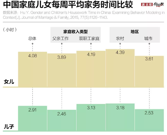 中国家庭中女孩的家务劳动时间明显高于男孩,她们从小就会被分配更多的家务劳动。