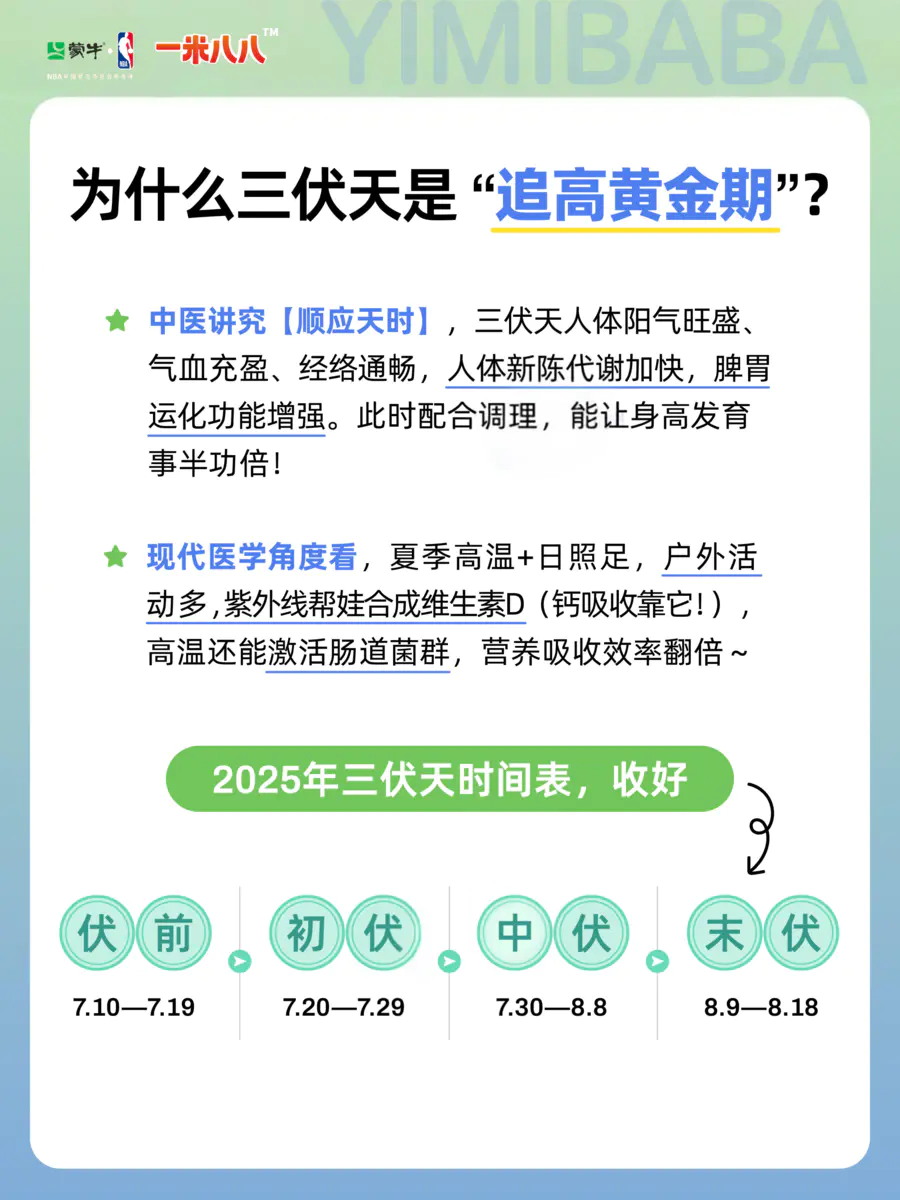 📅2025三伏时间表先码住👇 伏前培元:7月10日-7月19日 初伏:7月20日-7月29日(10天) 中伏:7月30日-8月8日(10天) 末伏:8月9日-8月18日(10天) 身高不是突然窜的!天时(三伏)+饮食+运动+睡眠=猛长!今年一起帮娃清内热、养脾胃、多运动、睡好觉,多长3-5cm真的不是梦~💪