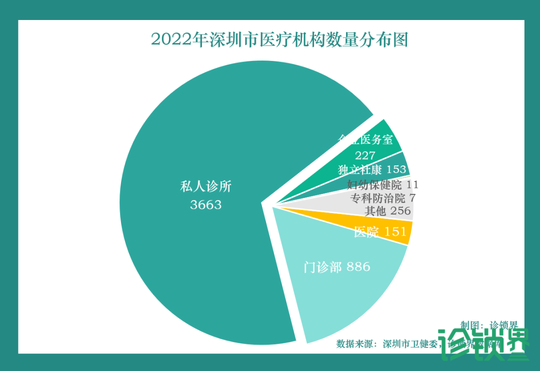 根据深圳卫健委公开统计数据,2022年末深圳拥有医疗卫生机构5201家(不含640家非独立社区健康服务中心),医院151家。其中,三甲医院仅有32家,不仅落后于北京、上海、广州,也少于郑州等中部城市。很多中东部省会城市的医疗实力,目前都要强于深圳。因而在医疗资源供给板块,深圳从“医疗洼地”迈向“全国样板”,很大一部分依靠的是蓬勃发展的社会办医力量。在2022年深圳公布的医疗卫生机构组成中,深圳的私人诊所加门诊部数量占到了87.4%。