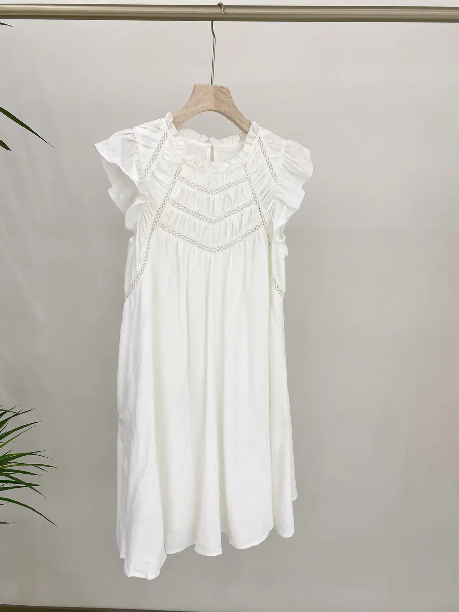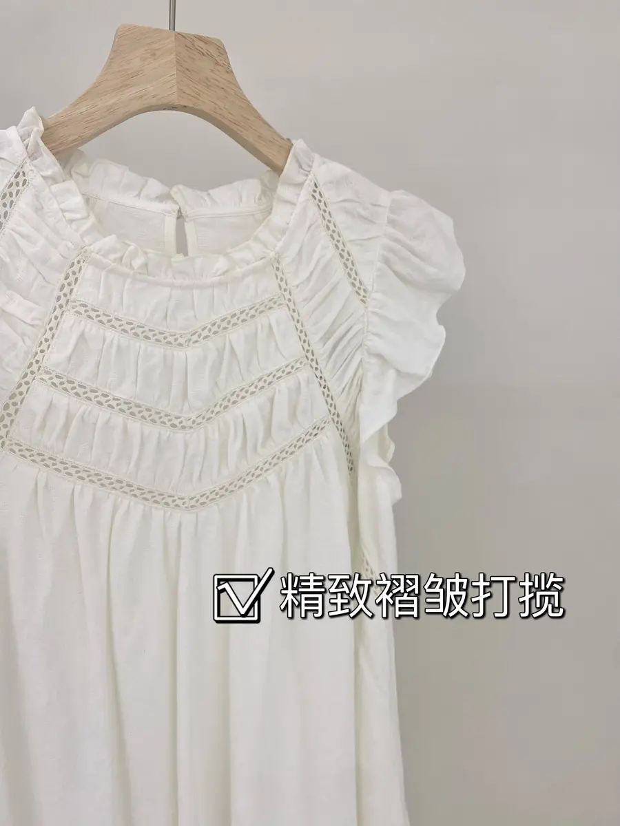 最大的亮点在于领口的设置,褶皱打揽+小飞飞袖,减龄又可爱,拼接镂空的织带,进行视觉分割,不会让裙子包裹性太强~
