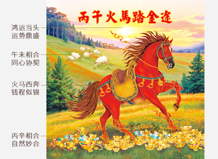 丙午年天干属火,故为“火马”。画面中马匹姿态昂扬向西而行,正合五行中“火克金为财”之理,动态演绎出奔赴前程、开拓财源的奋进之势。