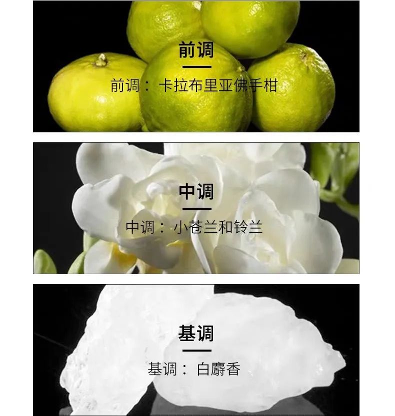 前调:卡拉布力亚佛手柑,甜中带水果香气的新鲜感,开启你的嗅觉,一如青涩的初恋。