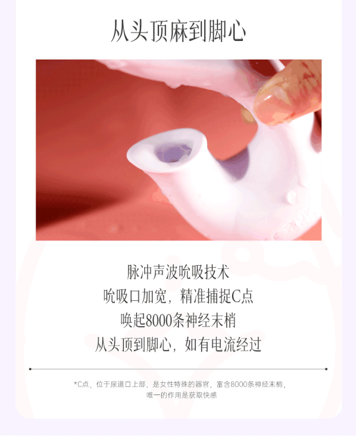 第一次用,不知道怎么找准位置;身体过于敏感,用吸口低档都会疼;快乐过于迅猛,哗得一下就没了。 而月小芽的吸口,比大多数吮吸玩具都要深,差不多有一个手指节那么深,约2cm。