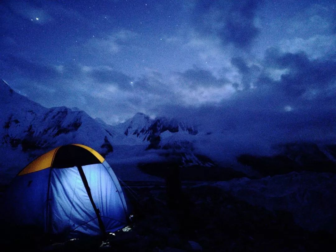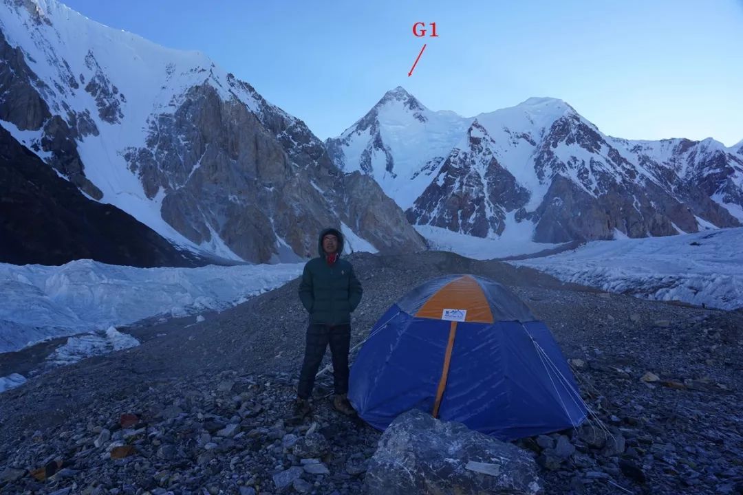 G1营地,身后尖形的山就是G1峰(迦舒布鲁姆Ⅰ峰),这个营地海拔5040米,四周全是雪山,脚下是冰川,就像在一个大冰柜里,晚上的气温大约是-15度。