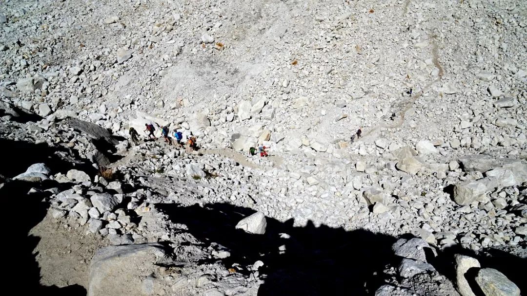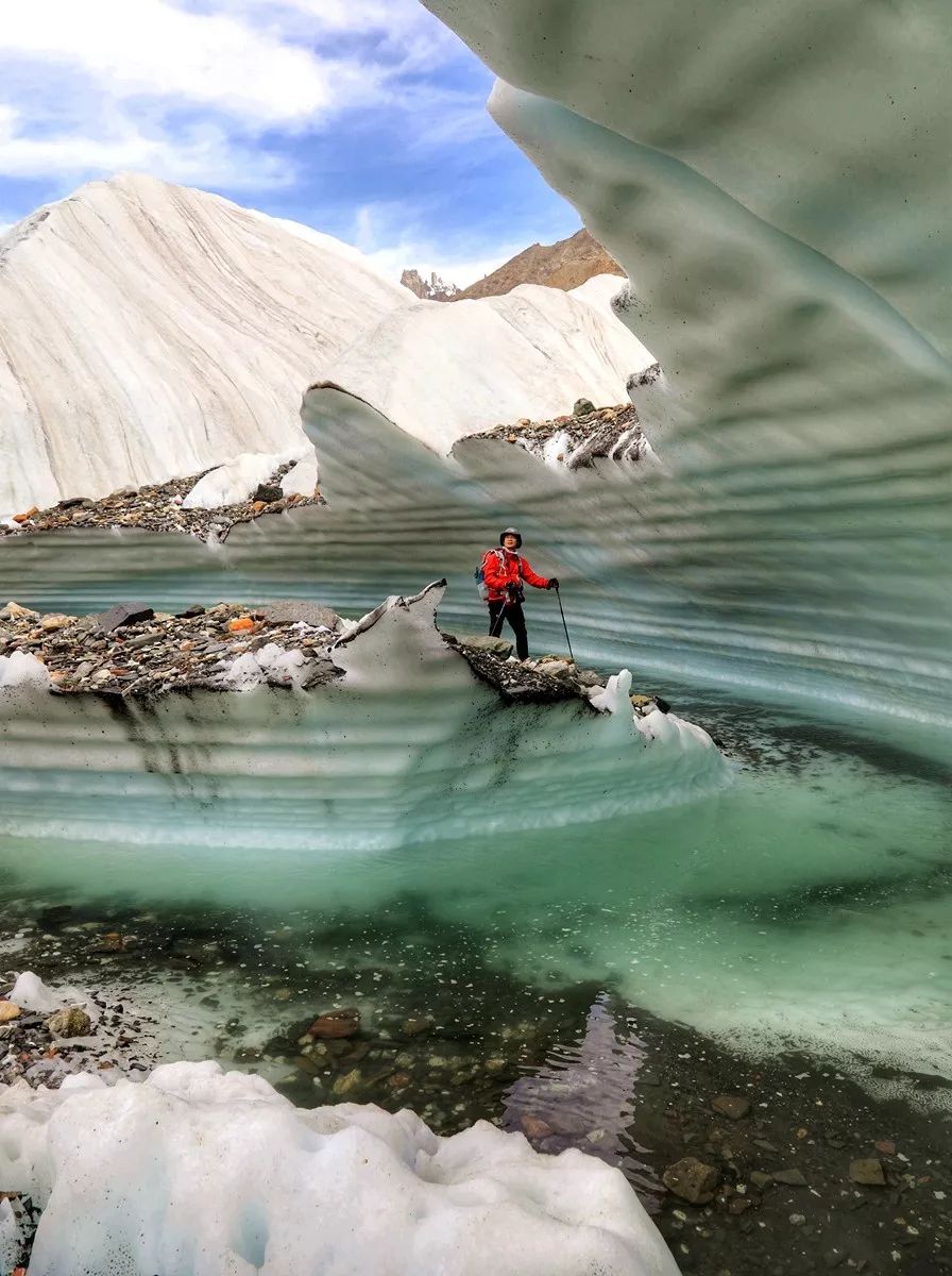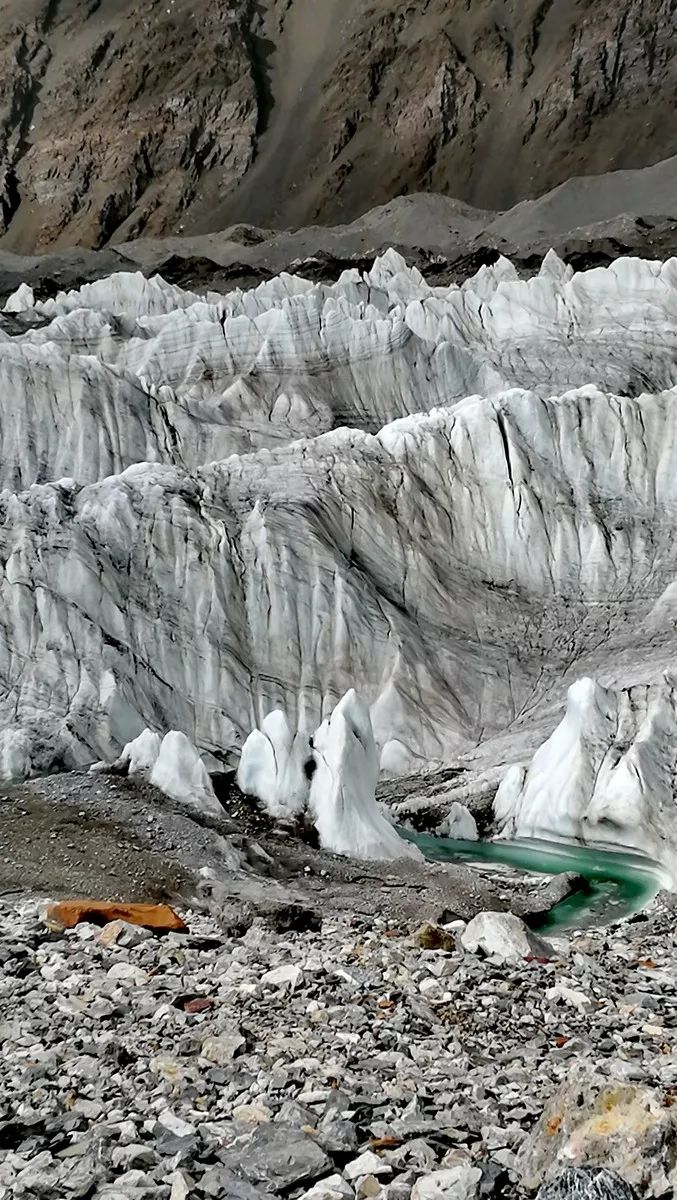 没来之前,我以为冰川徒步就是穿着冰爪在纯净的冰雪上行进,但在喀喇昆仑山脉却不一样,这里大部分冰川被乱石覆盖,在这些松动的乱石上上坡下坡,腿使不上劲还要随时注意崴脚,非常不容易!