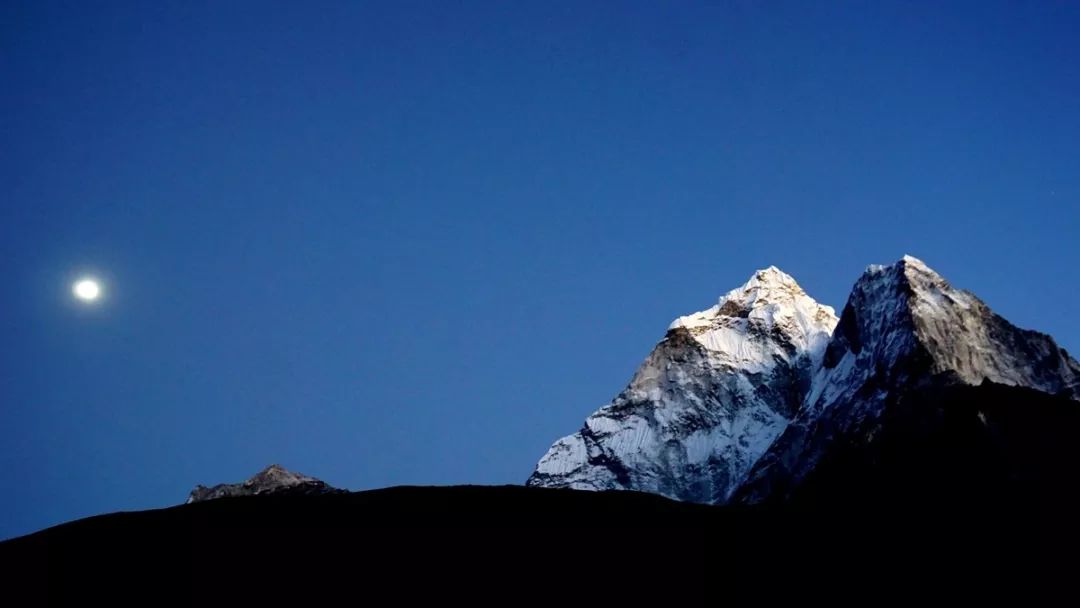 南池观景台(3800米+),左起:努子峰(7855米)、珠峰(8844.43米)、洛子峰(8516米,世界第4)、阿玛达布拉姆峰(6856米)。
