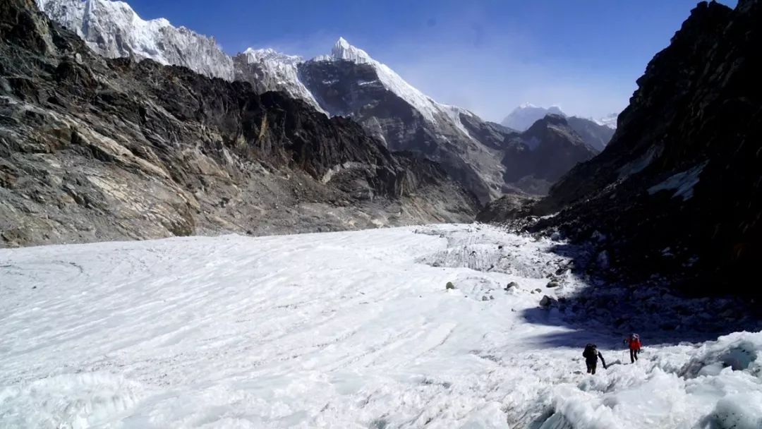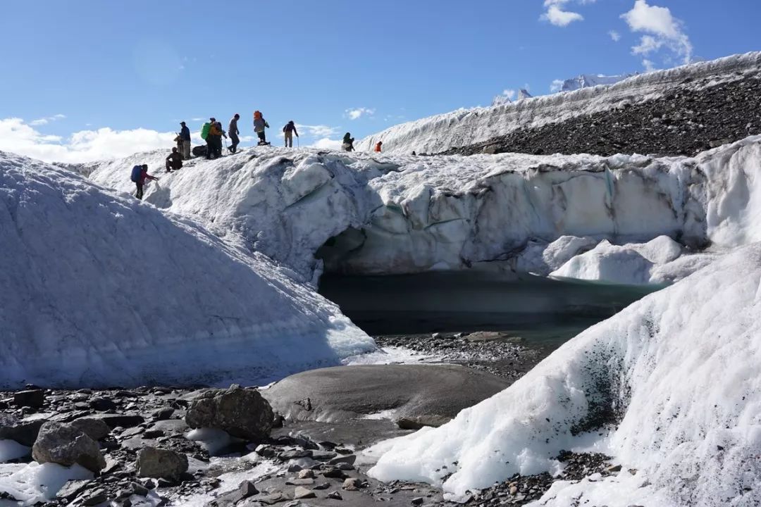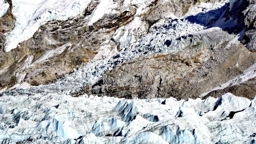 由于地球的温室效应,冰川严重退化,这里大部分冰川被黄灰色的乱石覆盖,只有小部分露出了白中透蓝的本色。