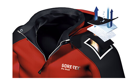 使得采用 GORE-TEX Pro Shell 的服装在透气性能上得到了大大的增强,更能有效的保证了户外运动员在运动中的汗气能够迅速的排除,改善了内部的阻力和摩擦力,减轻了衣服的重量,也使得衣服和中间层之间可以轻松滑动,它是一款专为户外专业人士所准备的产品,是严酷环境下的专业选择。