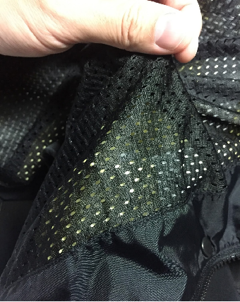 以上是GORE-TEX外套,内侧可以看到黑色的网格内里和里面黄黄白白的GORE-TEX薄膜是分开的,这就是两层结构啦!