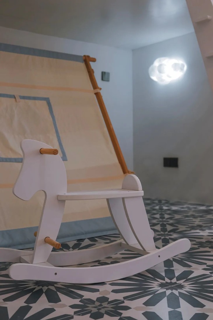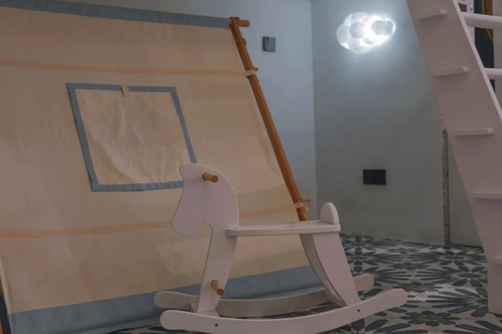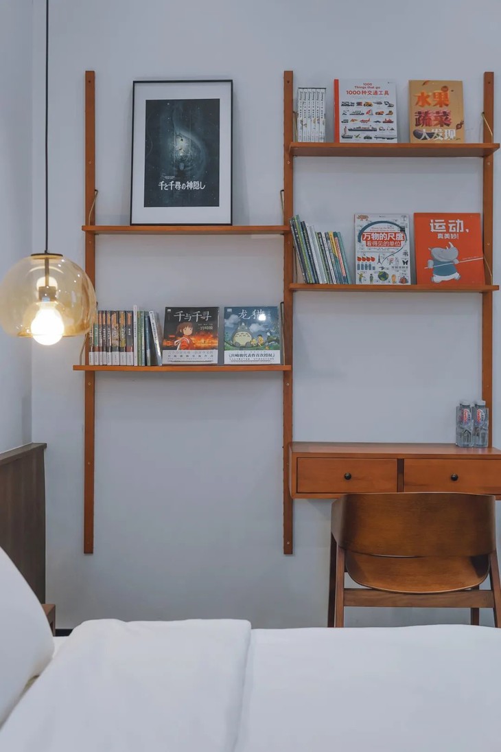 这是一个关于童年、关于成长的房间。房间的设计中加入了构想童年书单、滑梯等童趣元素。