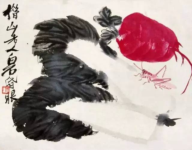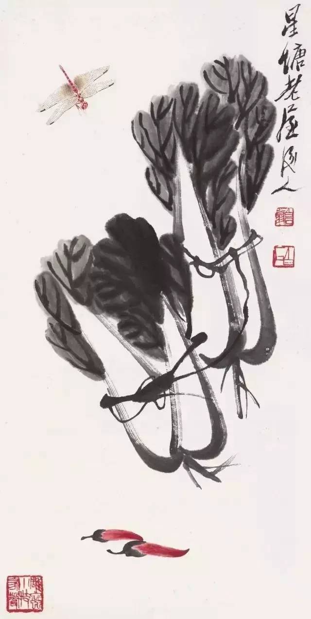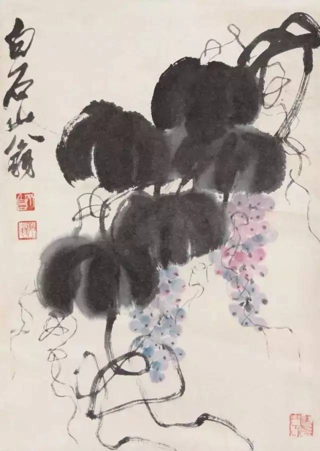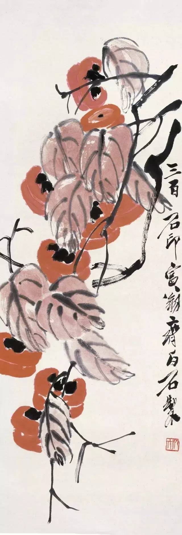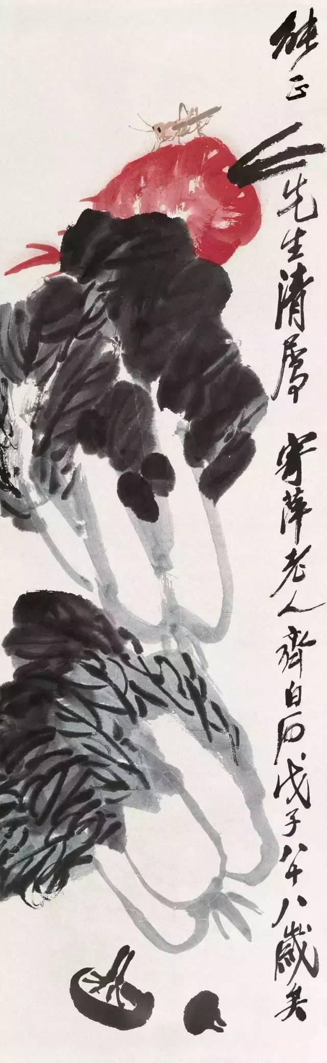 浓厚的乡土气息,纯朴的农民意识和天真浪漫的童心,富有余味的诗意,是齐白石艺术的内在生命,而那热烈明快的色彩,墨与色的强烈对比,浑朴稚拙的造型和笔法,工与写的极端合成,平正见奇的构成,作为齐白石独特的艺术语言和视觉形状,相对而言则是齐白石艺术的外在生命。现实的情感要求与之相适应的形式,而这形式又强化了情感的表现,两者相互需求、相互生发、相互依存,共同构成了齐白石的艺术生命,即齐白石艺术的总体风格。