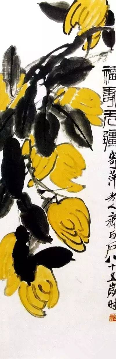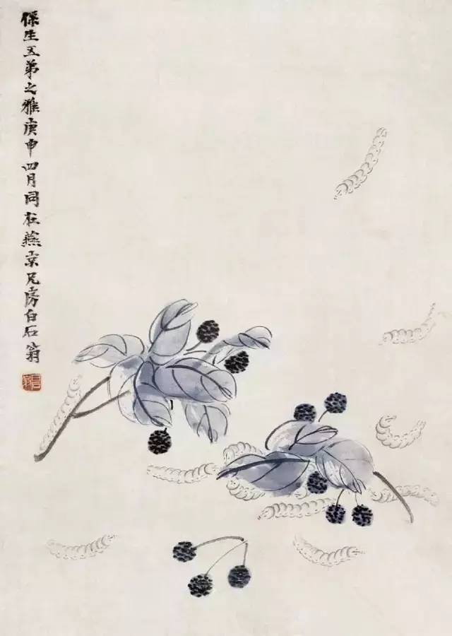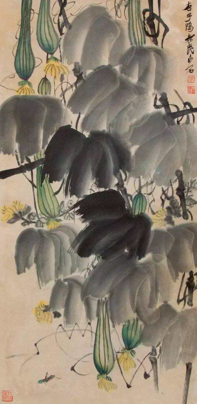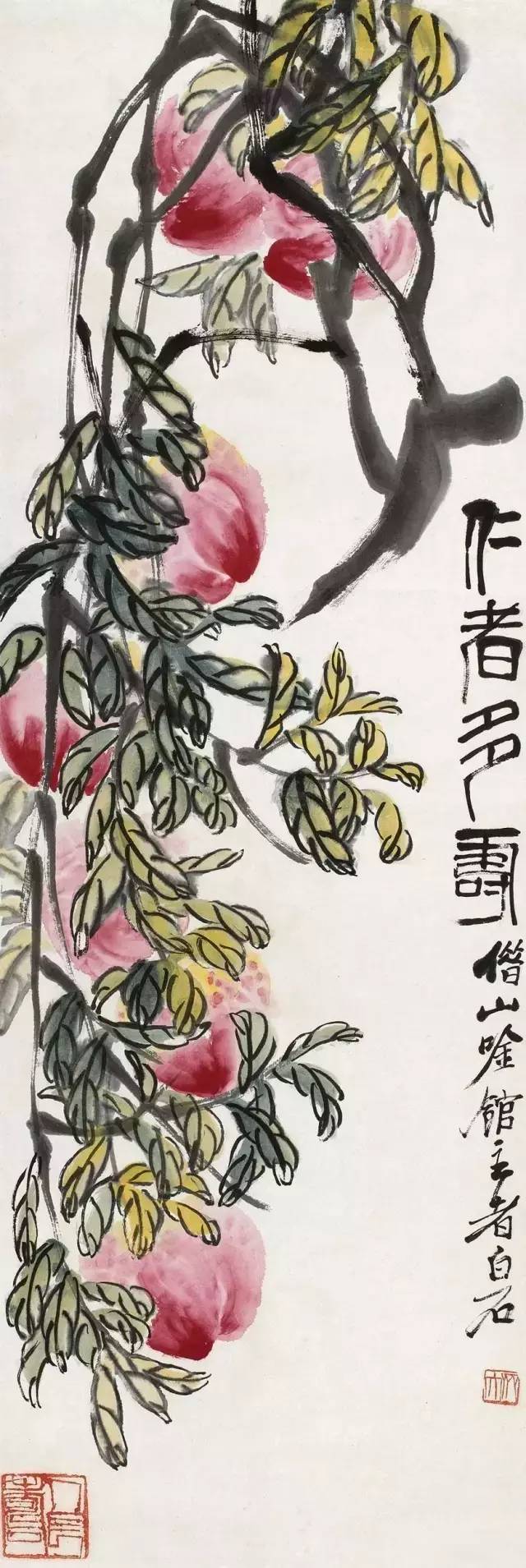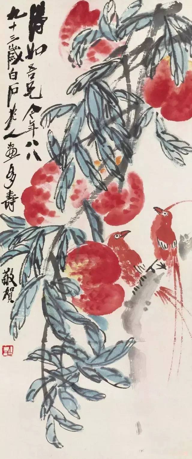 浓厚的乡土气息,纯朴的农民意识和天真浪漫的童心,富有余味的诗意,是齐白石艺术的内在生命,而那热烈明快的色彩,墨与色的强烈对比,浑朴稚拙的造型和笔法,工与写的极端合成,平正见奇的构成,作为齐白石独特的艺术语言和视觉形状,相对而言则是齐白石艺术的外在生命。现实的情感要求与之相适应的形式,而这形式又强化了情感的表现,两者相互需求、相互生发、相互依存,共同构成了齐白石的艺术生命,即齐白石艺术的总体风格。