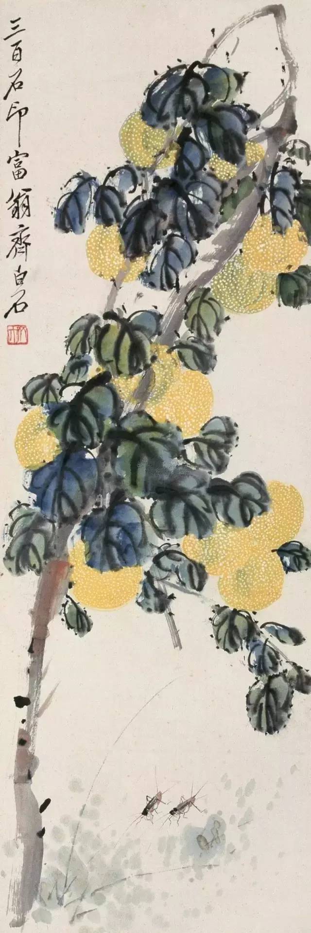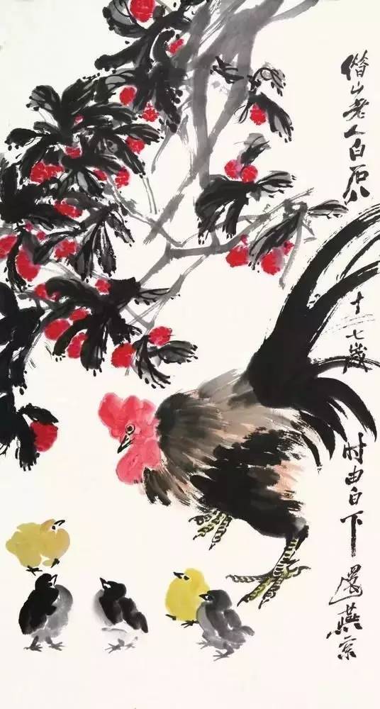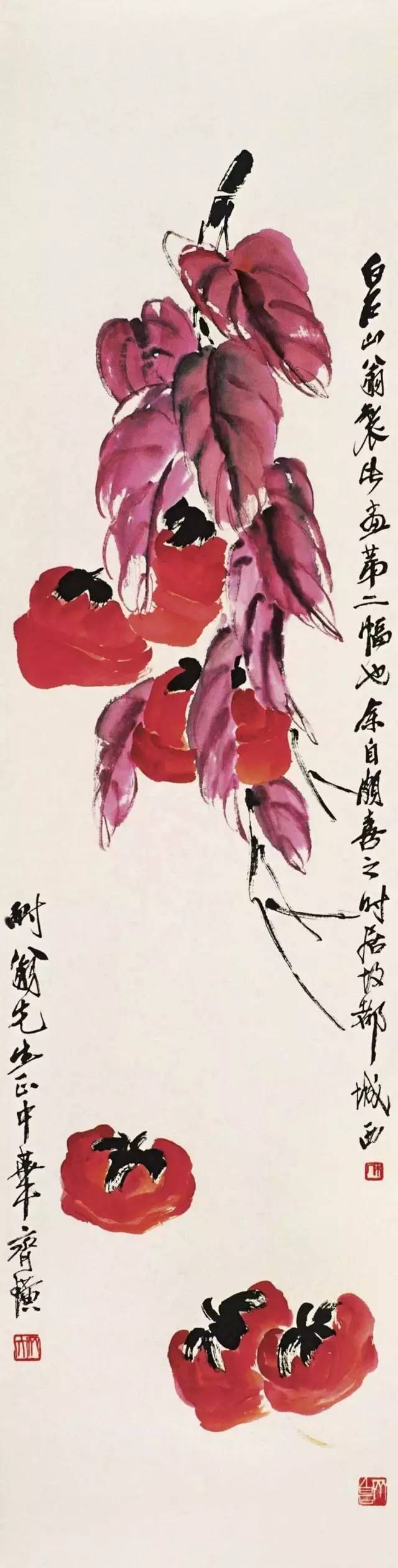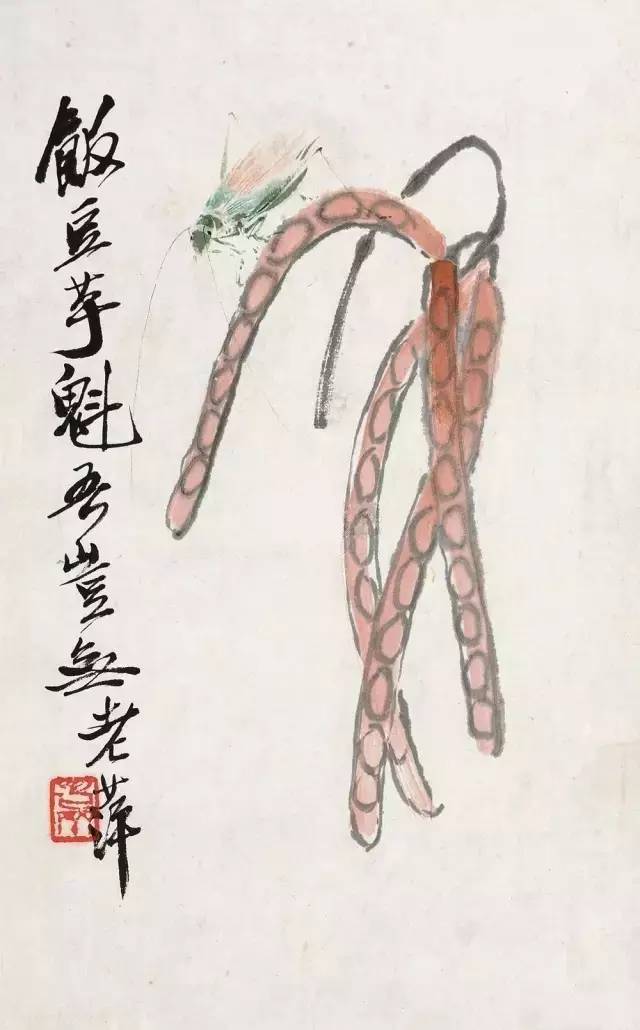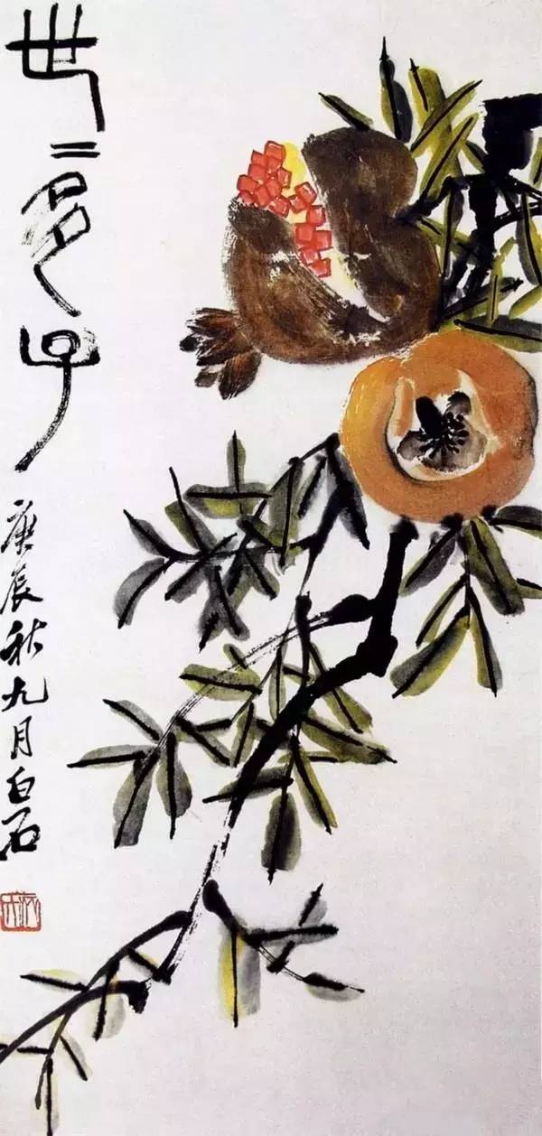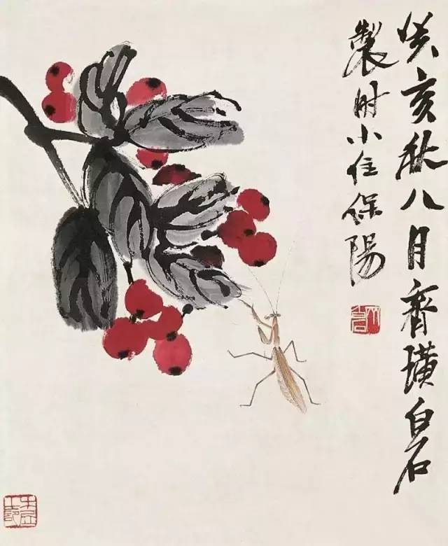 齐白石在绘画艺术上受陈师曾影响甚大,齐白石同时吸取吴昌硕之长。齐白石专长花鸟,笔酣墨饱,力健有锋。但画虫则一丝不苟,极为精细。齐白石还推崇徐渭、朱耷、石涛、金农。尤工虾蟹、蝉、蝶、鱼、鸟、水墨淋漓,洋溢着自然界生气勃勃的气息。山水构图奇异不落旧蹊,极富创造精神,篆刻独出手眼,书法卓然不群,蔚为大家。齐白石的画,反对不切实际的空想,齐白石经常注意花、鸟、虫、鱼的特点,揣摩它们的精神。齐白石曾说:为万虫写照,为百鸟张神,要自己画出自己的面目。齐白石的题句非常诙谐巧妙,齐白石画的两只小鸡争夺一条小虫,题曰;“齐白石日相呼”。一幅《棉花图》题曰:“花开天下暖,花落天下寒”。