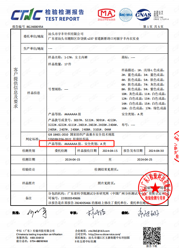 经过质检报告的检测,货真价实的A类内裤!