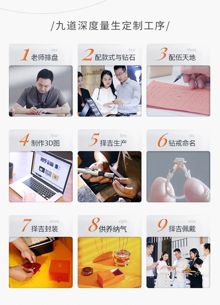 首批和气钻戒按照天地能量也划分阴阳五行:木、火、土、金、水各6款,共计30款钻戒类型。专业老师会根据缘主“人生棋盘”最需要、最适合的某一种五行,来为您“量生定制”更适合的五行钻戒。当然,也可以根据缘主的爱情、事业、健康、财富、旺丁求子等愿望去选择不同的五行和气钻戒,助力加持,帮助缘主收获人生幸福。中华传世珍宝,当然不能只是外形上的改变。中国自古就是礼仪之邦,不管是对君王,还是对天地,亦或是神明,都要有礼仪,那么对于中华易学珠宝的新创作,自然也要愈发恭敬。和气钻戒从生产到佩戴,都严格遵守九大工序,让每一枚钻戒都能量满满,纯净而神圣,也让与缘主的“相互契订”阶段可以更加的和谐,助力缘主的人生运势。