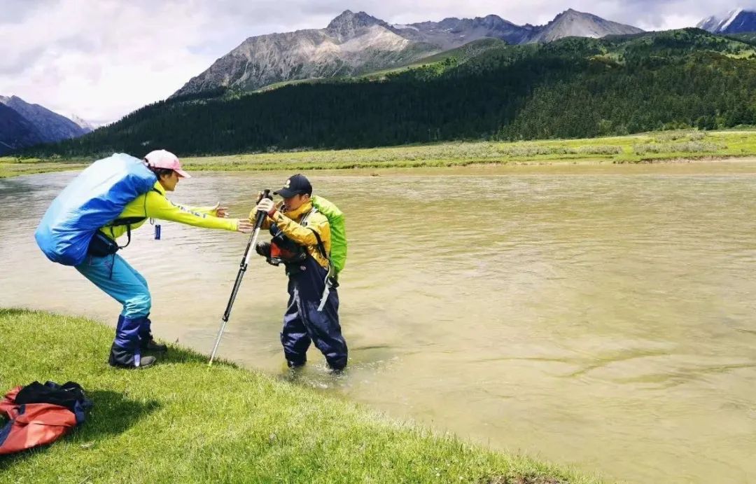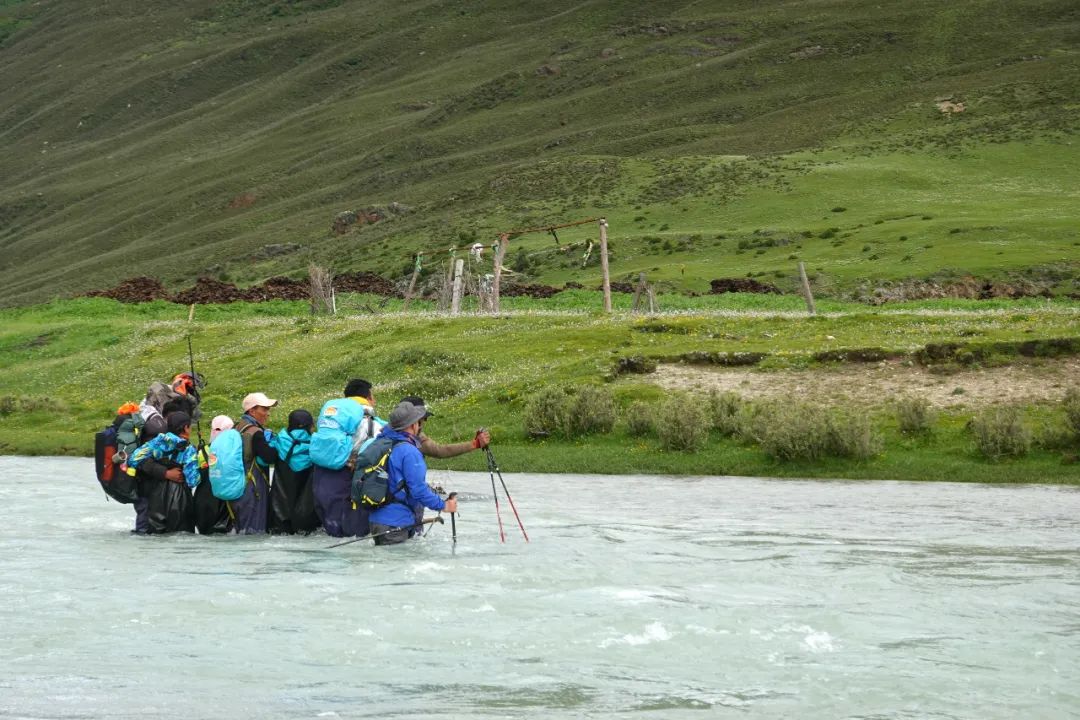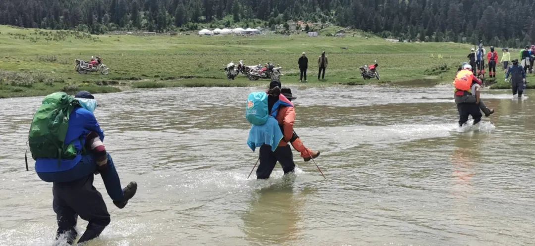 到热梯营地三四公里前需要过河,甭管是被早已守候在河边的当地向导直接背过去,还是自己换上队伍里准备好的渔夫裤蹚过去,都是一种新奇的体验。