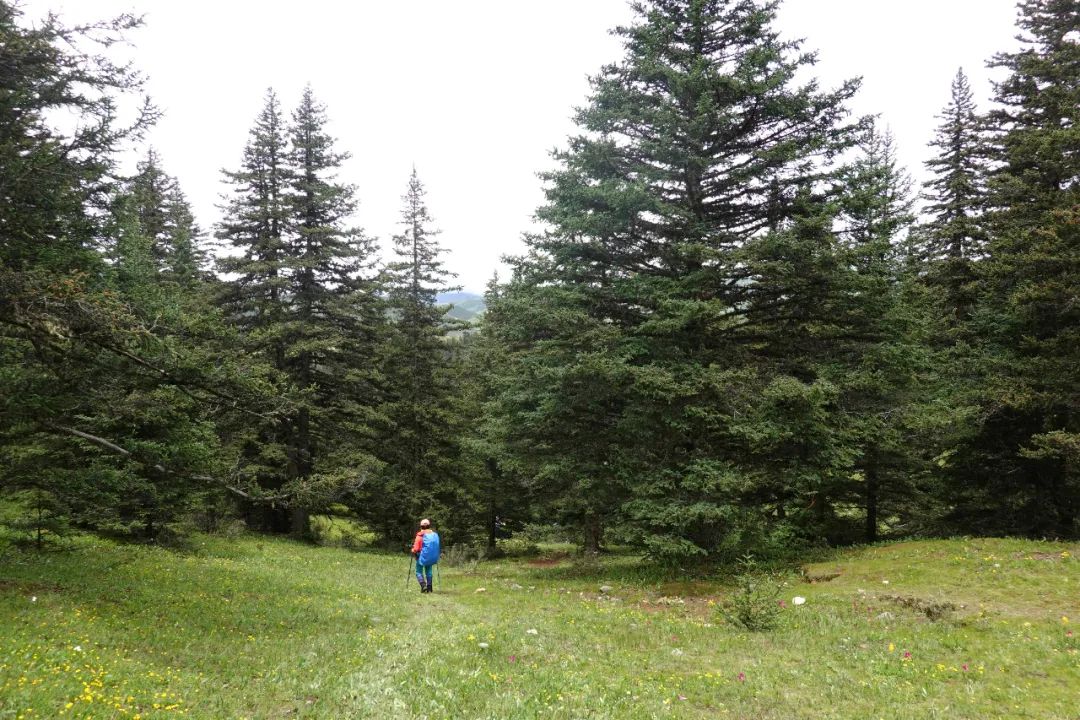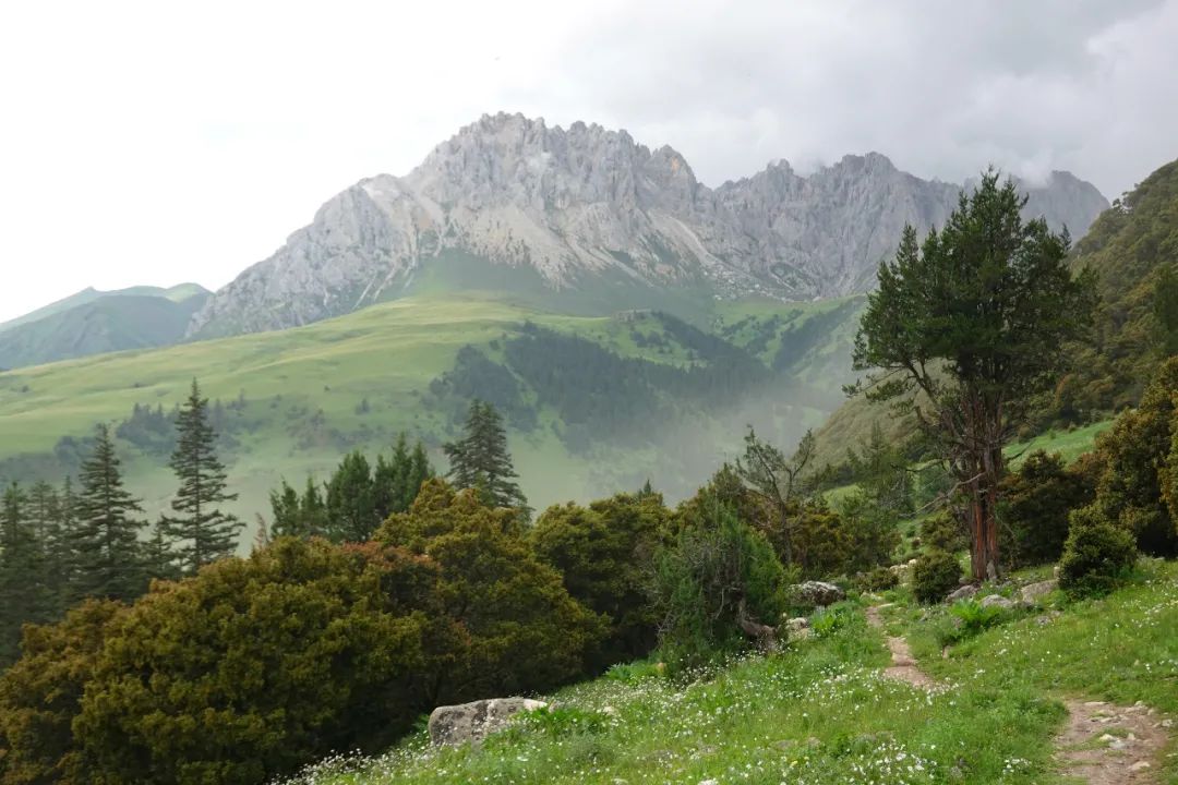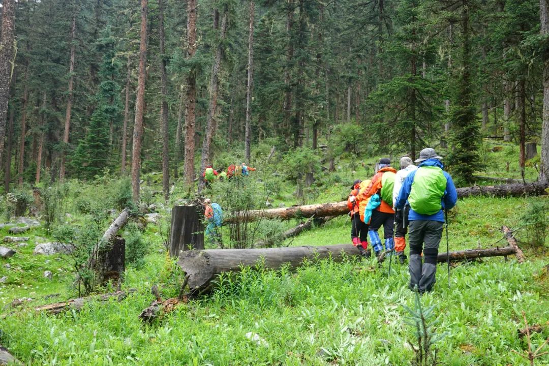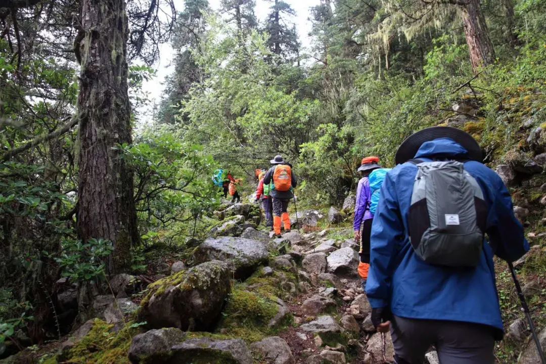 从虎皮坝营地出发,穿过新冷古寺,便进入一段原始森林爬坡路段,沿山脊横切,行走林中。约1.5h后,走出丛林,蓦然闯进草甸花海。