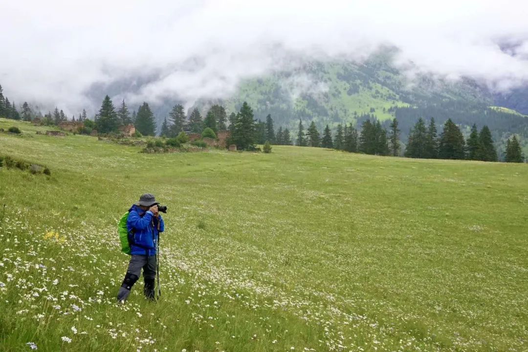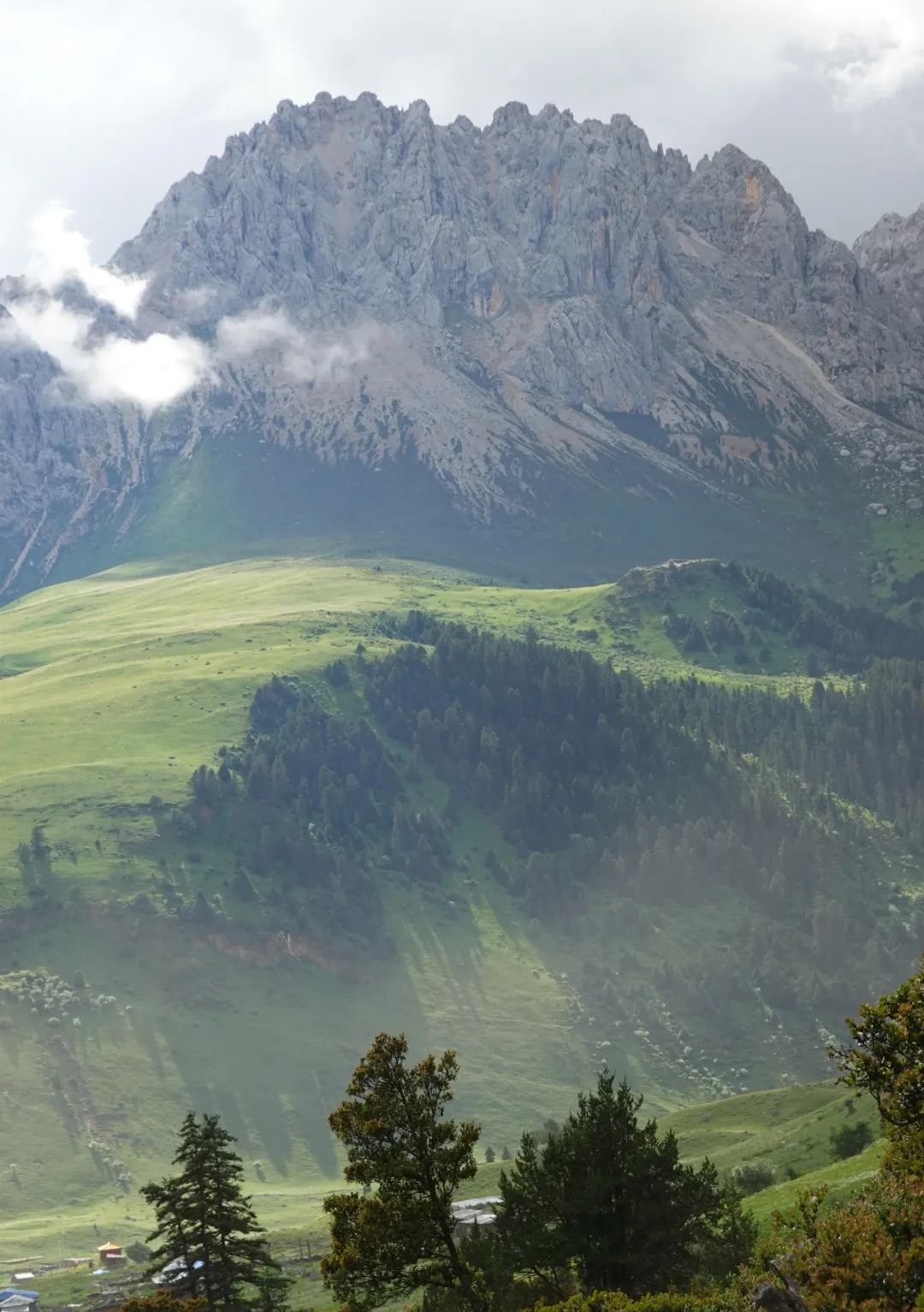 那日本来整天阴云,阳光却在我们目光相接的瞬间拨开了云层,从半山腰的枝叶间望下去,几处木头房子乖巧地匍匐在大群脚下,被阳光打亮,画面被房屋、树林、草甸、山峰裁成几块,层层堆叠……我几乎“寸步难行”,只想停下来一直狂拍。