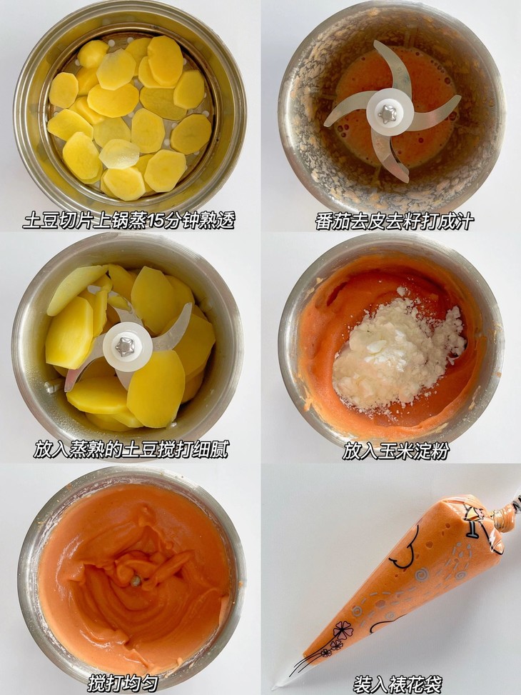 ❶ 土豆切片上锅蒸15分钟熟透, 番茄去皮去籽打成汁❷放入蒸熟的土豆搅打细腻,放入玉米淀粉,搅打均匀,装入裱花袋