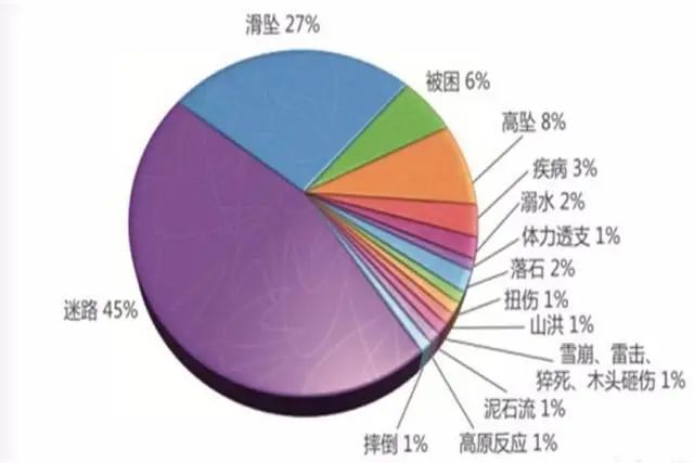 据2016年中国登山协会的调查数据显示,户外安全问题已经成为目前影响旅游健康的最大因素。其中,迷路最常发生,占比率为45%,远远高于其他事故。