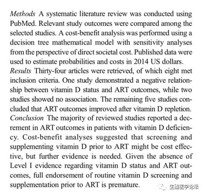 Pacis M.M等之前发表的的研究显示,大多数回顾性研究报道的维生素D缺乏症患者的ART妊娠结局下降。成本效益分析表明,在ART之前筛查和补充维生素D可能具有成本效益。
