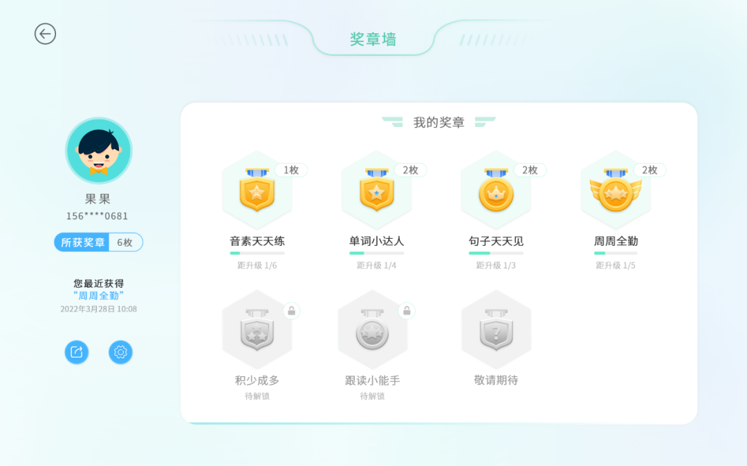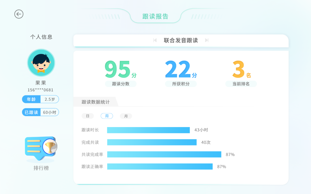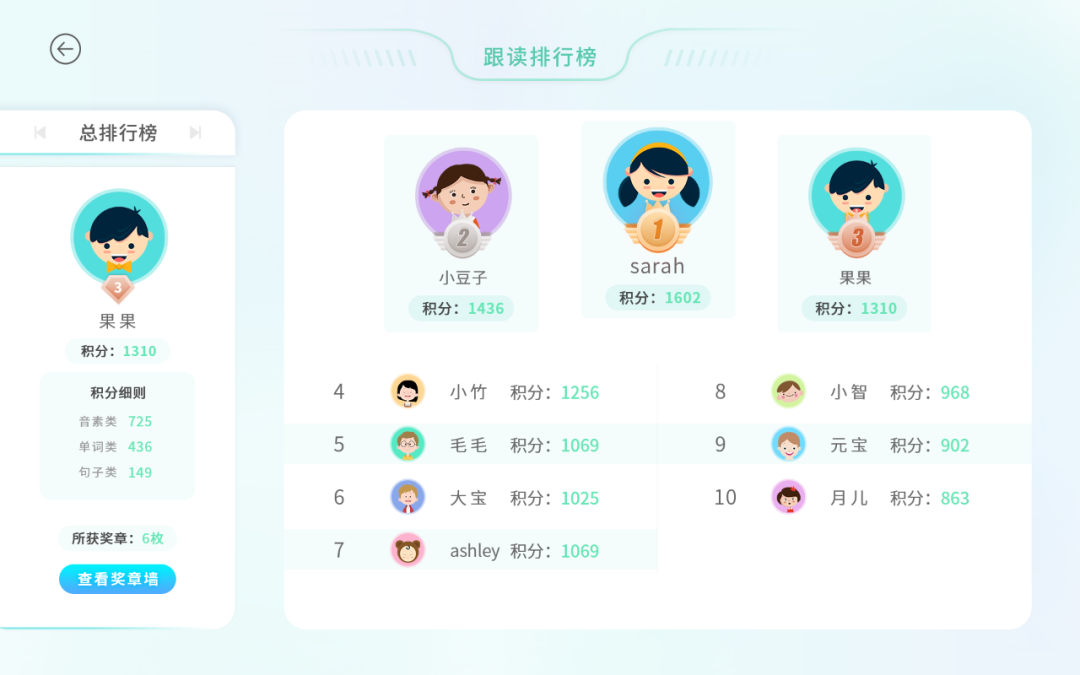 为了更好地激励使用者完成跟读练习,系统设置了“我的奖章”“跟读排行榜”,以及“跟读报告”等功能。