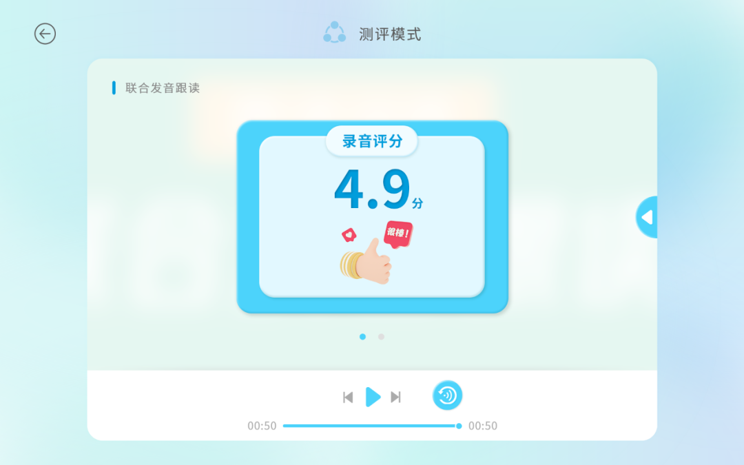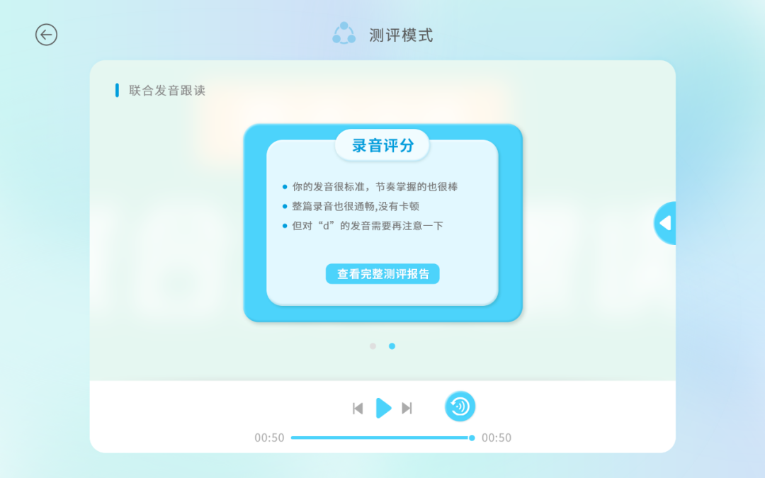 测评模式下,跟读后会给出分数以及测评报告,适合练习到一定程度后通过测评,给予用户一定的量化参考,用以辅助加强跟读的练习效果。