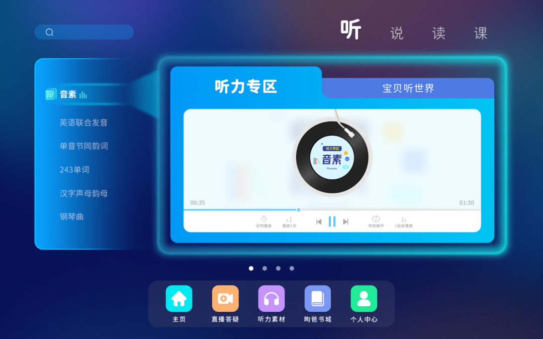 下图就是“听音素”的界面,怎么样?是不是有点惊艳?因为操作逻辑更贴合用户使用逻辑,所有的素材功能、音视频课程都非常容易找到。
