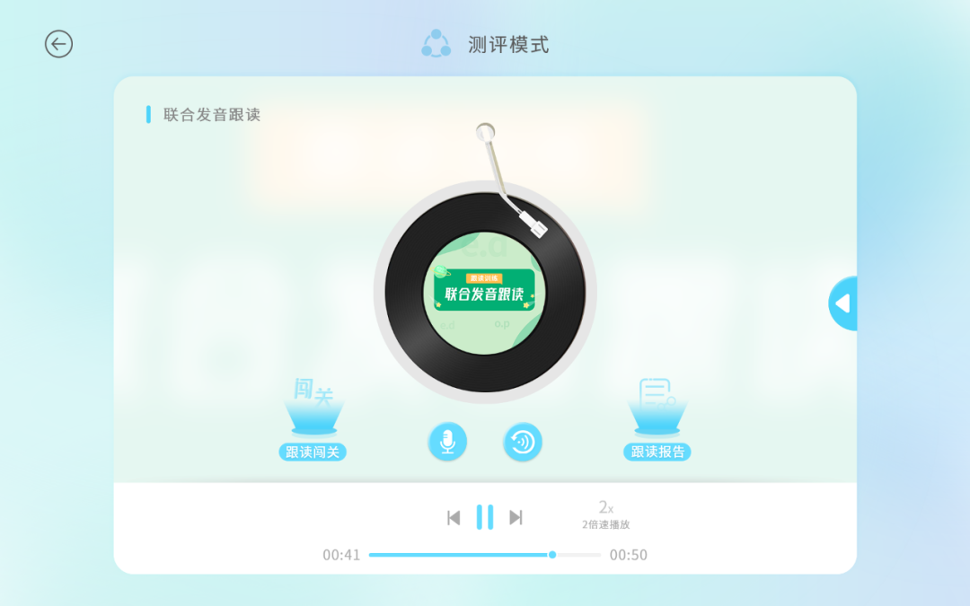 “睿智”2.0系统跟读模块,设置有“训练模式”和“测评模式”两种跟读模式。