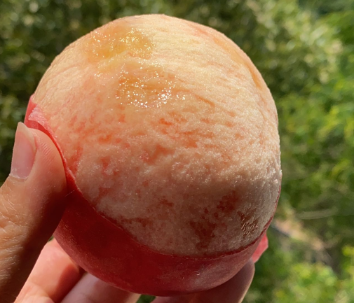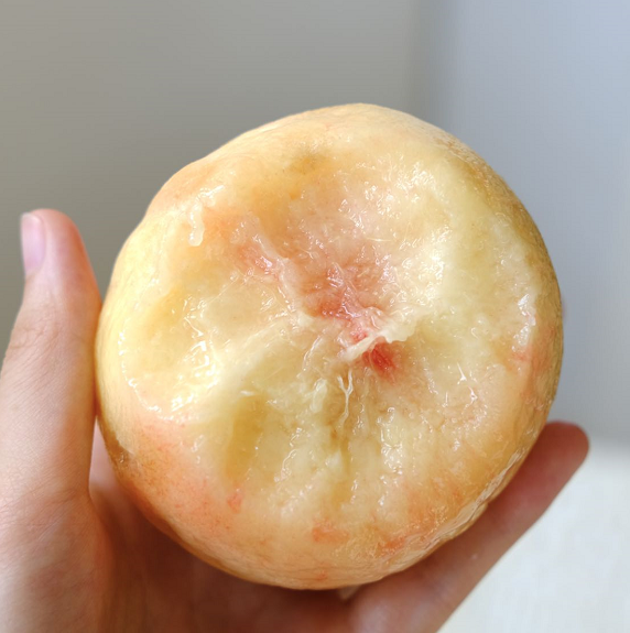 合格的水蜜桃,一定要是皮薄易剥!成熟的突围水蜜桃,不需要轻轻滚一滚的步骤,直接找准方位徒手撕即可,比剥香蕉还容易!
