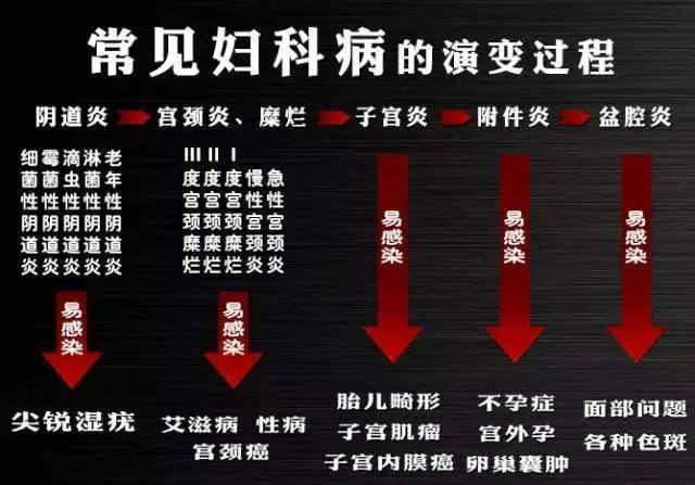 症状有:白带有异味、多、黄等一些症状,炎症虽小,但不治不行,因为时间一长就会让妇科炎症蔓延。第一步:向上蔓延就引起宫颈炎,因宫颈没有痛感神经,这个阶段,女性是没有感觉的,还以为只是普通炎症。第二步:它就会慢慢形成,宫颈息肉,宫颈肥大,宫颈粘膜炎。第三步:最后宫颈糜烂、(一度、二度、三度),最终癌变。宫颈癌是最常见的妇科恶性肿瘤,各个年龄层的女性都有可能发生宫颈癌,但以25岁到55岁的妇女最为常见,它是最常见的癌症之一,也是死亡率极高的女性杀手,死亡人数占全部癌症死亡人数的18%。很多人说,“病来如山倒”,其实真的不是的!所有严重的问题,都是在最初最轻的时候,你不引起重视,或者选择了不正确的治疗方法,慢慢积累恶化而来的。很多人一有外阴炎骚痒,就用洗液,洗液是止痒了、却破坏了阴道正常的PH值,越洗越脆弱越容易犯妇科!再次发作时,就不只是外阴炎了!细菌向里走感染变成滴虫、念珠等等阴道炎了,然后细菌继续向内到宫颈、再往里到子宫内膜、继续入侵到你的附件、深入到盆腔。打针、吃药、手术治疗,这一切的传统治疗妇科的方法,都只是治标而已!!!然后,好了三五个月,妇科又发作了!也许你自己没更多感觉,其实比上一次是更恶重了!为什么久治不愈:生殖和手指脚趾一样,是末梢神经,受伤了,打针吃药,药效真正到达病灶部位,只吸收不到2%而已。为什么反复发作:生殖体子宫内残留很多垃圾,变成毒素,是产生一切妇科问题的根源,大家现在接受的是拿洗液、打针吃药,甚至手术都仅仅是治标,而没有把垃圾毒素倒出来,所以妇科问题才会反复发作。有女性朋友说了,我很爱卫生很干净的,我也很自爱,我的生殖内怎么会有垃圾和毒素?1.剥落不净的子宫内膜和干枯的经血;有的人例假提前、有的推后、量多、量少,还有的例假期生气等等;经血留在子宫里就排不出来,变成垃圾。以上这些垃圾日积月累,堆积成山,久而久之它就产生了毒素,万病起源于毒素。长斑、长痘、便秘、烦躁失眠,内分泌失调,夫妻生活不和谐,妇科问题反复、等等,都来了。有人为了脸蛋漂亮,买昂贵的化妆品,做昂贵的脸部护理;殊不知,一切的根源,在花的根部,根部呵护好了,花会开得非常娇艳!