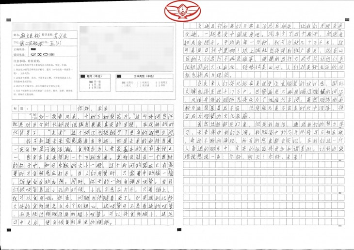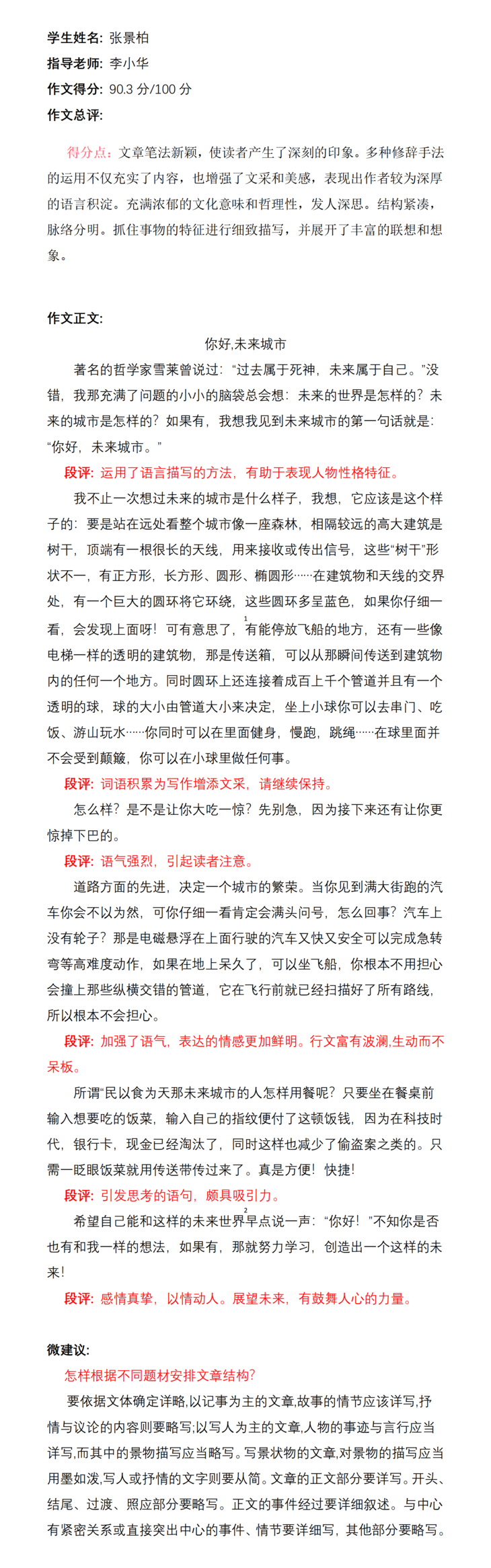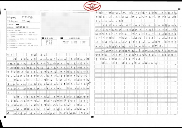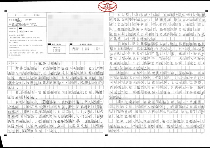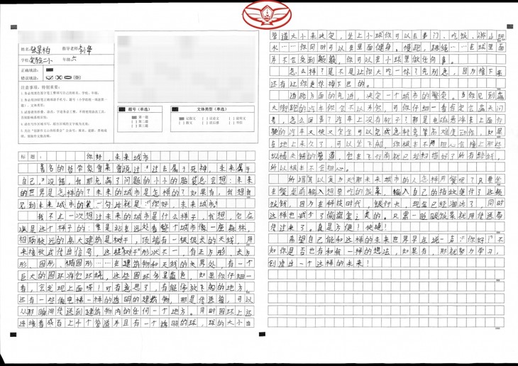 这是一篇想象作文,孩子接到:"未来世界是什么样"这个题目时,欣喜若狂的跑到我面前:"妈妈,未来的世界将会是智能时代,对吗?"我说:"当然",在日常生活当中,孩子就对很多东西充满了好奇,经常提出问题,我们对孩子提出的问题也尽量给予解答。孩子的脑袋里都是各种各样的新奇想象,分别描写了未来城市建筑的模样,道路的先进以及文明用餐的方便,更对创造美好未来充满信心!