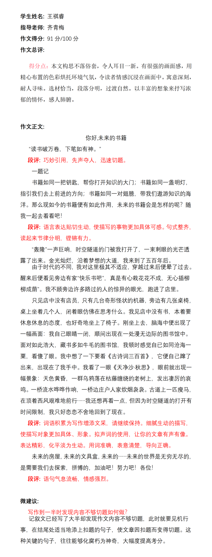 结构为总分总,开头运用排比的修辞手法,描述现在的书籍的作用,为下文未来的书籍作铺垫。先描写未来的书店,近而引出书店中的书籍。重点描写了未来书籍如何使用。结尾总结未来的世界是无穷无尽的,只有人们积极开动大脑,才能够创造未来,十分得正能量!
