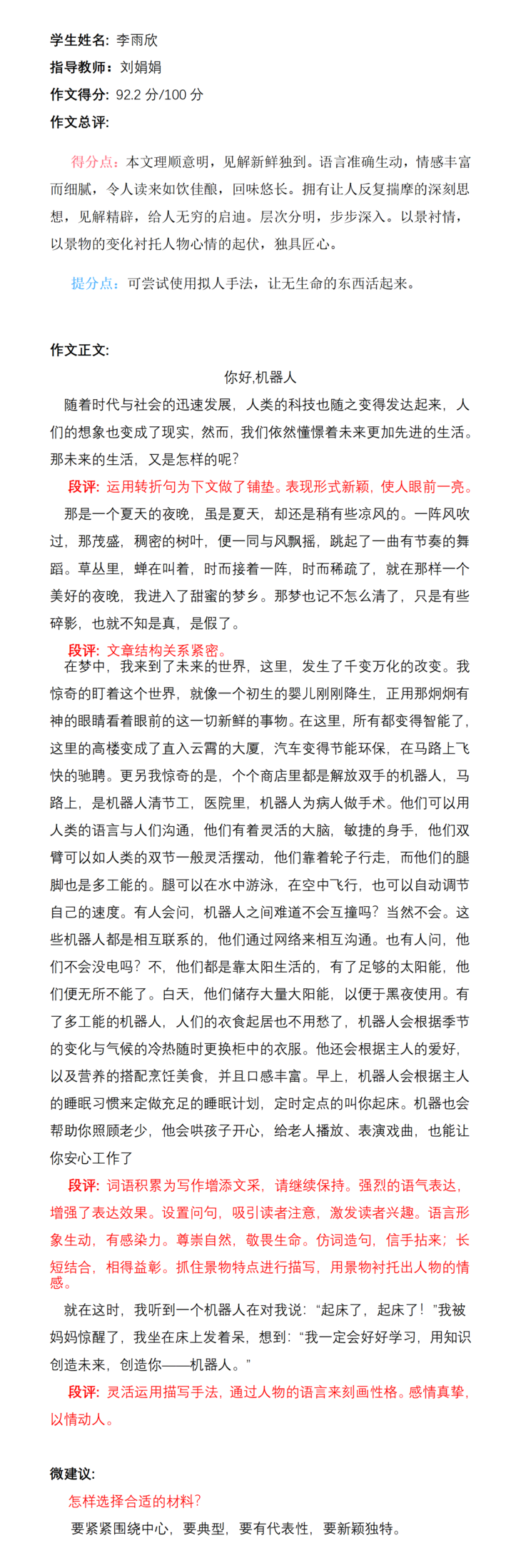 文笔自然清新,抓住了未来机器人“智能”这一特点展开描写,始终以“梦”贯穿全文。语言准确,形象具体,仿佛机器人就在眼前,结尾直抒胸臆,可见写作功底之深,佳作!