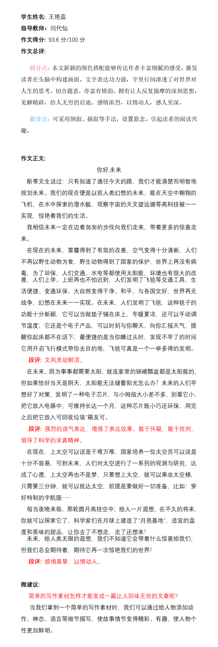 未来是美好的;未来是神奇的;未来是快乐的。在孩子们的童年里有着无数美好的想象和幻想,憧憬未来是每个孩子的天性。作为父母,我们平时注重孩子们的阅读,鼓励有自己的思考,也注重在现实生活中对孩子视野的开拓,经常带孩子去感受自然和科技的神奇,孩子的疑问有时候我会引导孩子向书去请教。在孩子写作时我会鼓励孩子大胆的想像,也注重对孩子的不足加以点拨。